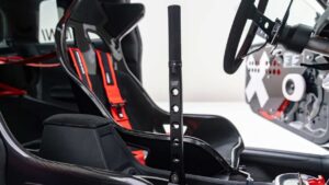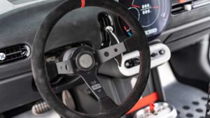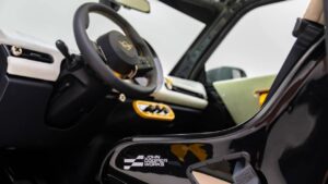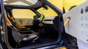 Внутри салон имеет более традиционную тему автоспорта, с крылатыми сиденьями в виде ведра, пластинчатым рулем и ручным тормозом, гордо стоящим на центральной консоли.