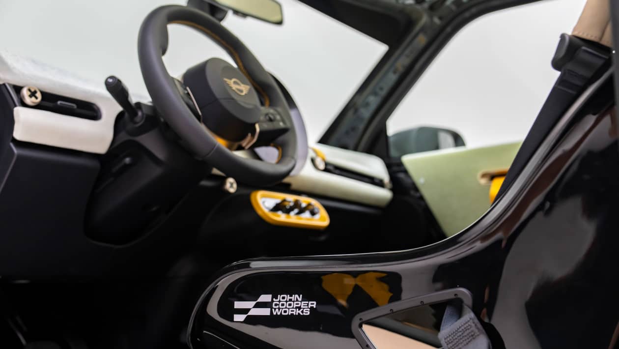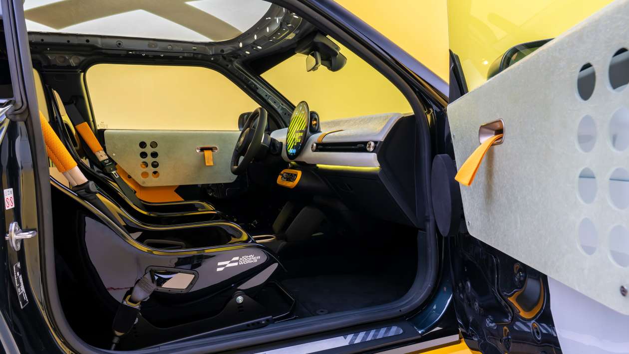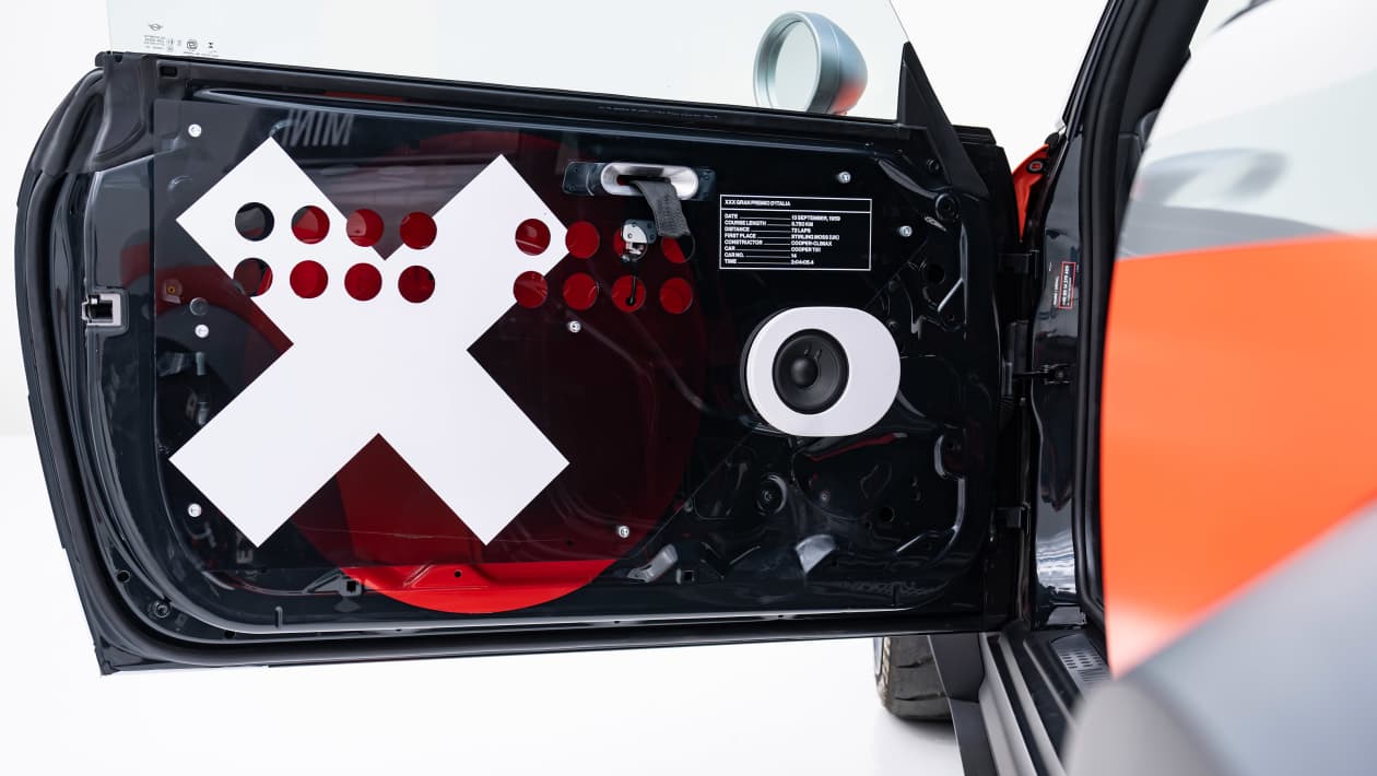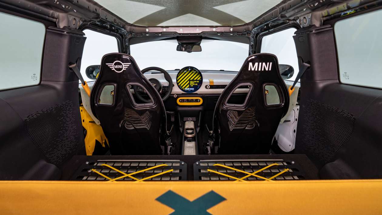 Кабина была агрессивно очищена от большинства ее компонентов, и новая панель из стекловолокна DashCoinboard и кувшинные сиденья, покрытые неопреном, канализируют подключения MINI к автоспорту.
