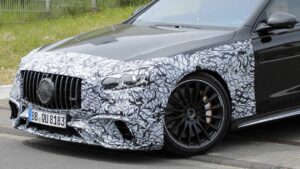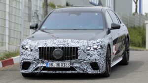 В передней части есть большая решетка (по-прежнему в форме Mercedes panamerica ), окруженная двумя слегка переформатированными фарами, которые используют новый трехконечный звездный стиль дневного освещения, уже увиденный на недавно обновленном EQS и предстоящем электрическом CLA.
