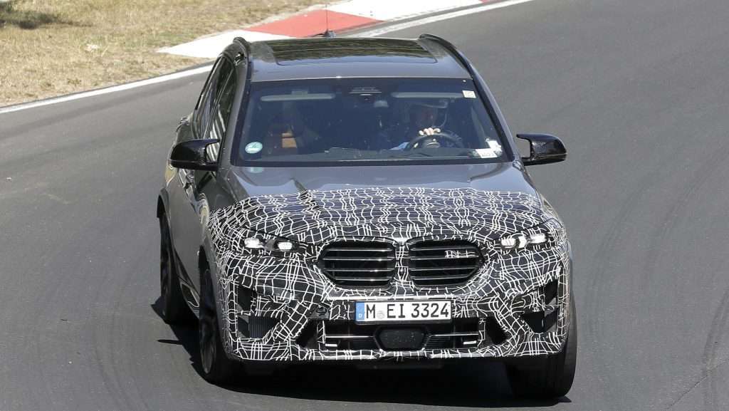 Хотя большая часть автомобиля все еще покрыта камуфляжем, мы видим, что X5 M получит пару более тонких фар — черта дизайна, которая недавно появилась на новых BMW, таких как последняя 7-я серия и электрический внедорожник iX. Они будут обрамлять новую пару решеток радиатора с более угловатым дизайном, хотя BMW сопротивляется установке набора негабаритных отверстий. Внутри решеток мы видим горизонтальные ламели — отличие от вертикальных в уходящей машине.