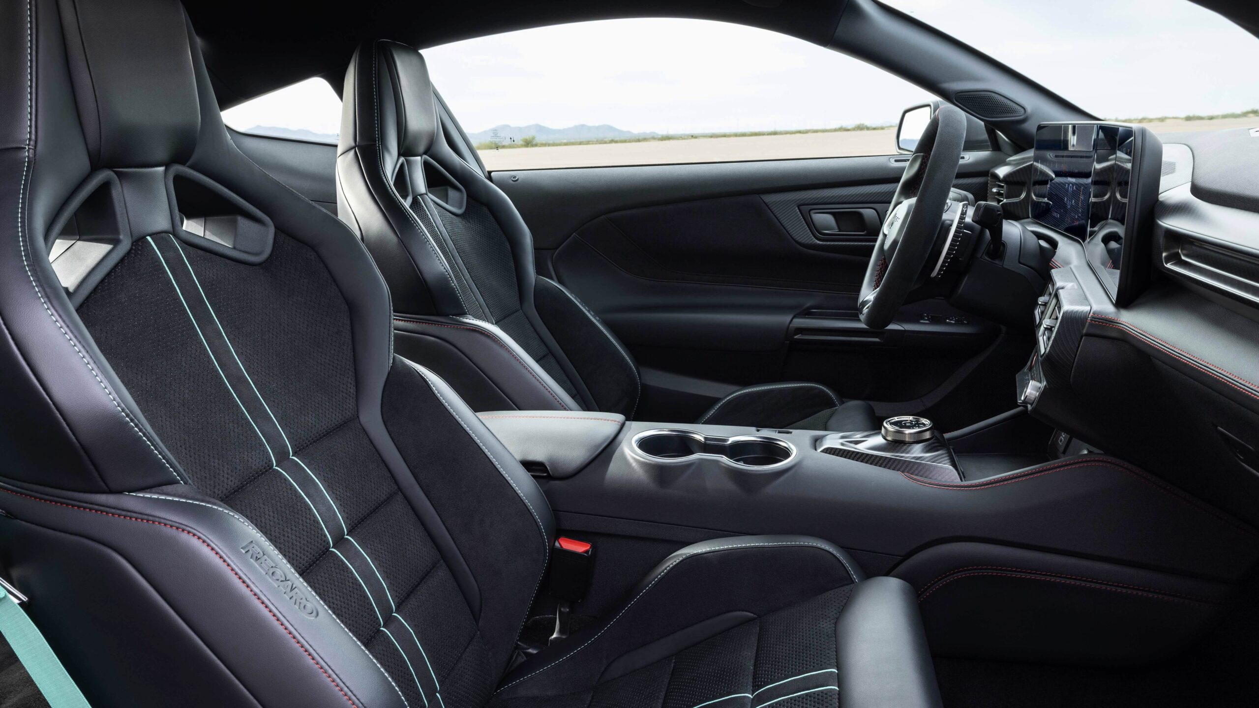 Интерьер Dark Horse SC вдохновлен GTD. Он получает то же самое рулевое колесо с плоским дном, которое сшито в красный цвет и обернуто в алкантару, а также с элементами из углеродных волокон. В другом месте есть набор спортивных сидений Recaro, обнимающих кузов, и больше углерода на центральной консоли и вокруг вентиляционных отверстий.