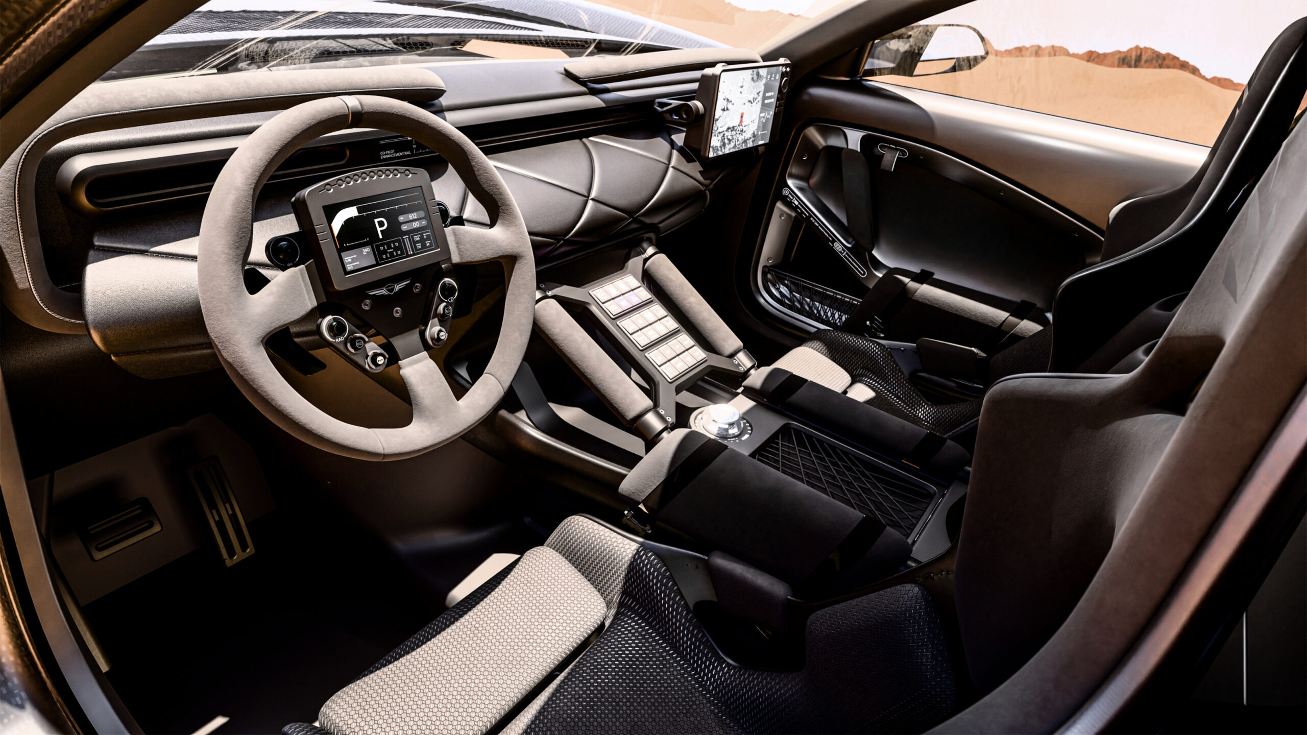 Genesis говорит, что интерьер представляет собой «роскошную встречу с внедорожной функциональностью», но помимо бриллиантовой панели DashCoinboard и кожевенного покрытия, компоновка чрезвычайно сфокусирована. Есть основная панель инструментов водителя, установленная на лицевой стороне гоночного колеса, полная рулевая коробка, сиденья с ведрами и четырёхточковые ремни.