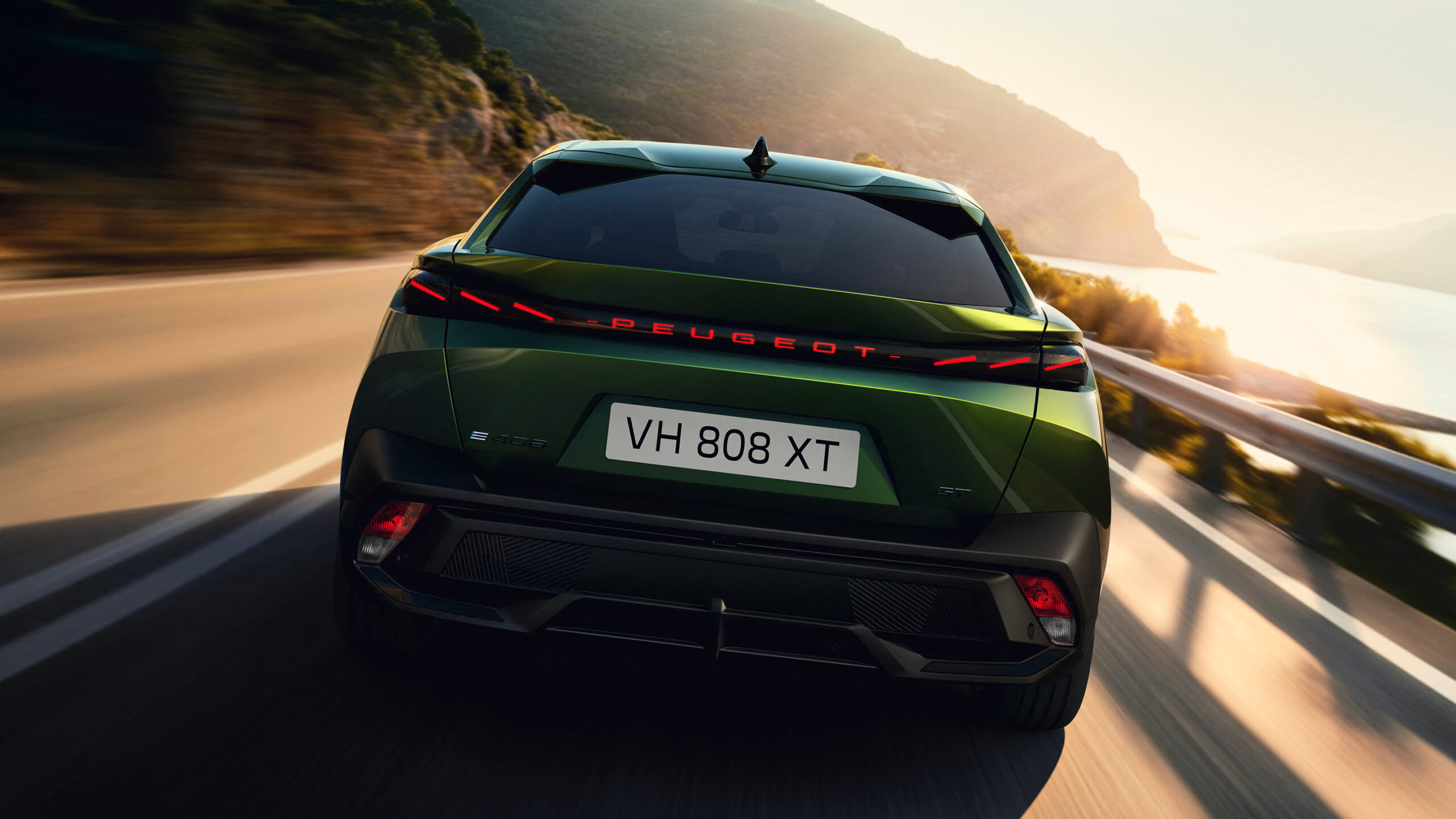 Гордость места в решетке — это освещенный щит Peugeot, который можно найти на моделях с лучшими характеристиками и сочетается с освещенными надписями Peugeot , которые были добавлены к крышке багажника. Новый 408 является первым автомобилем французской фирмы с этой функцией, которая интегрирована в прозрачную полосу, охватывающую заднюю часть, которая также соединяет новые задние фонари с тремя когтями.