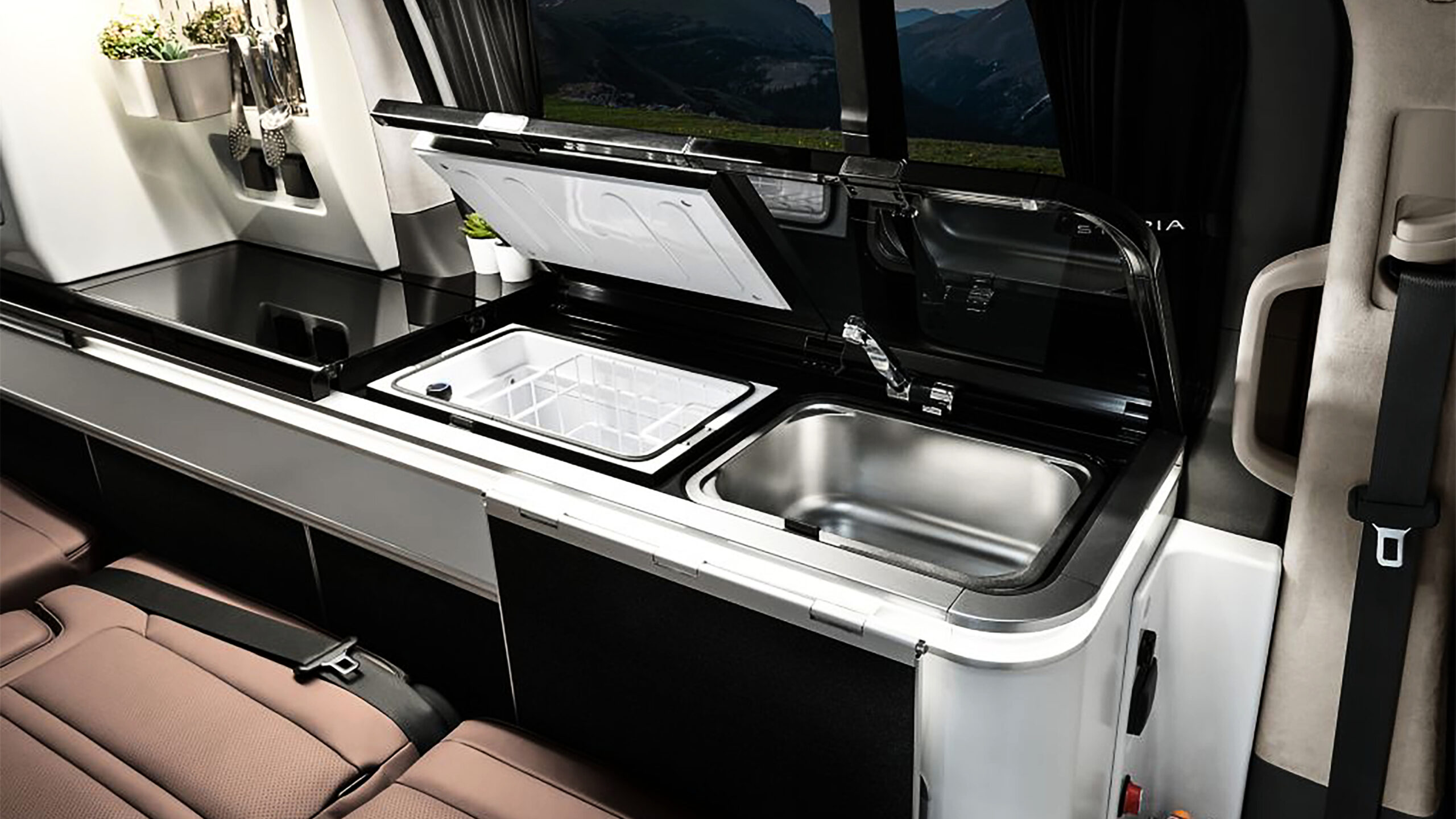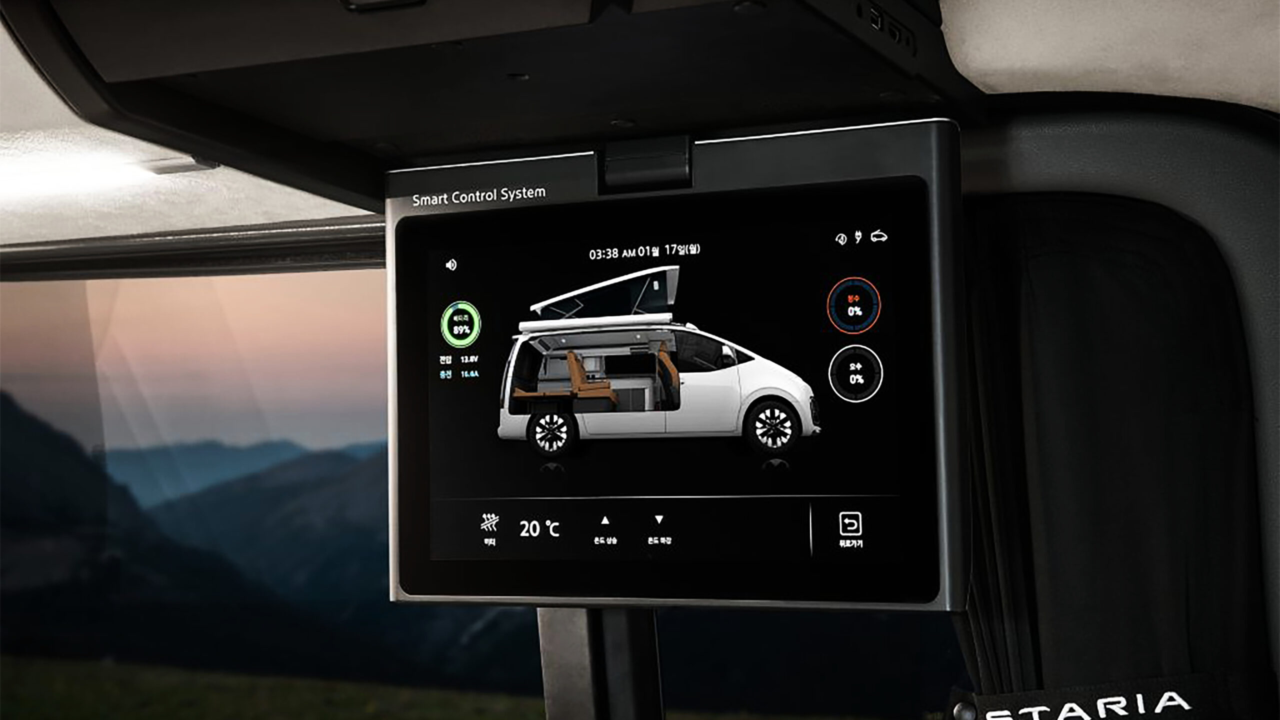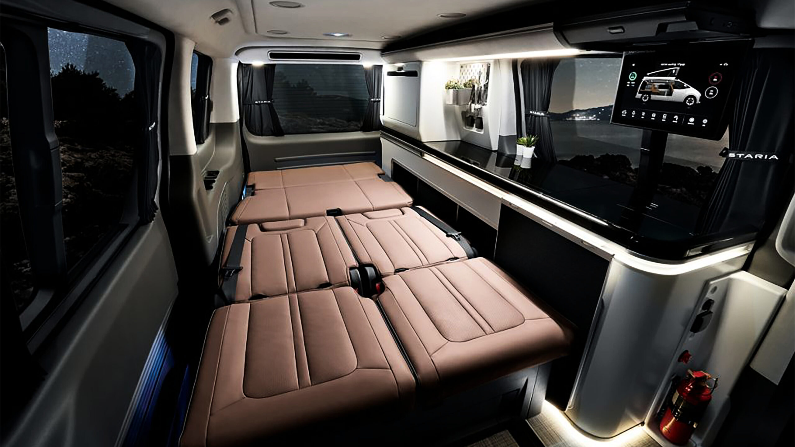 Концепция электрического кемпера Hyundai имеет обычные модификации, которые помогают сделать его домом вдали от дома. Есть встроенная всплывающая крыша, а задние сиденья складываются при нажатии на кнопку, чтобы создать двуспальную кровать. Также есть солнечная панель на крыше, которая может генерировать 2,6 кВтч электроэнергии в день, что может фактически расширить электрический диапазон Staria или поддерживать такие приложения, как 36-литровый холодильник, портативный душ и система контроля температуры кабины.