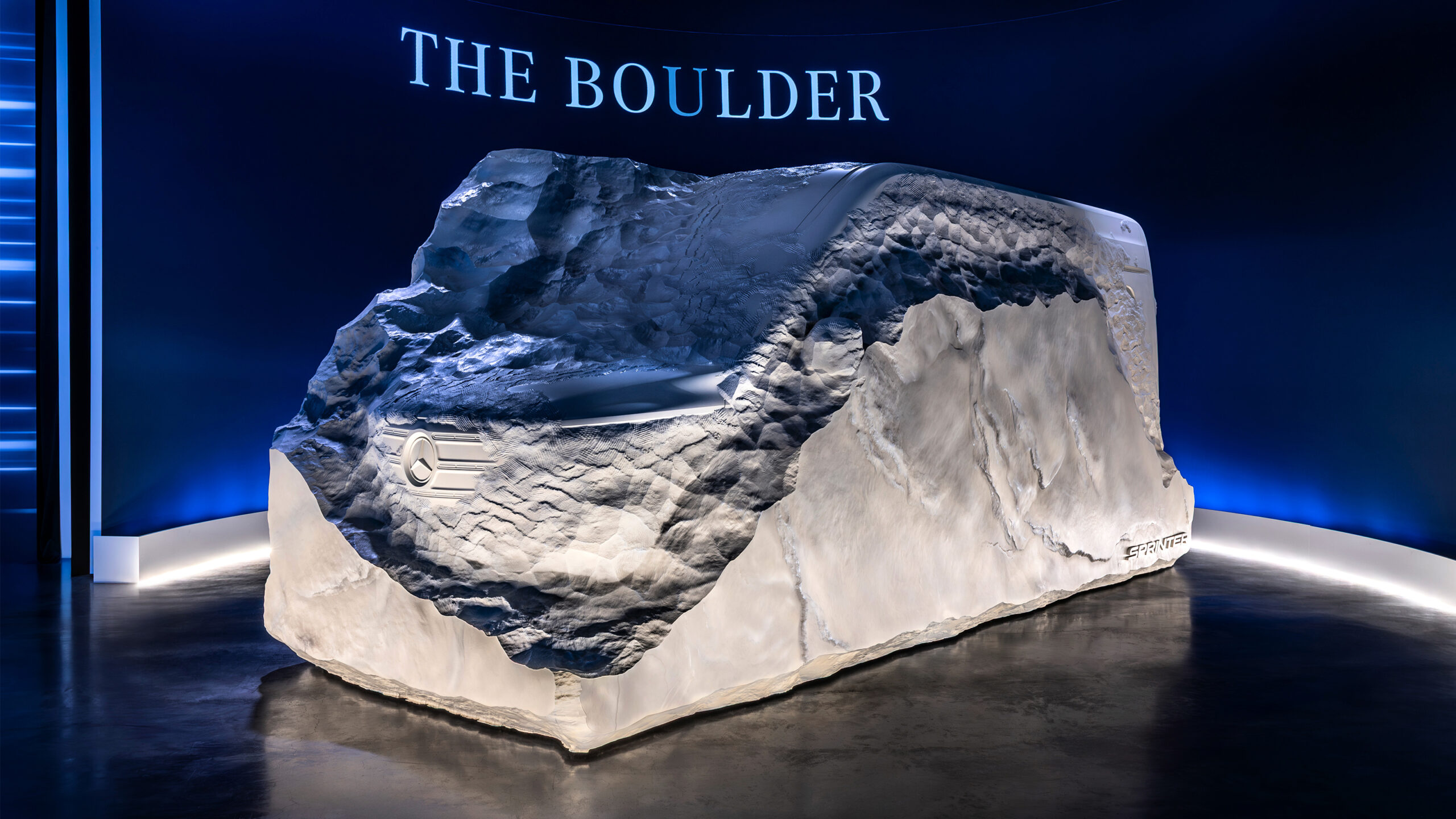 По крайней мере, это выглядит как камень; Мерседес говорит, что это на самом деле «каменная скульптура». в любом случае, это дает нам первый взгляд на четвертое поколение Sprinter.