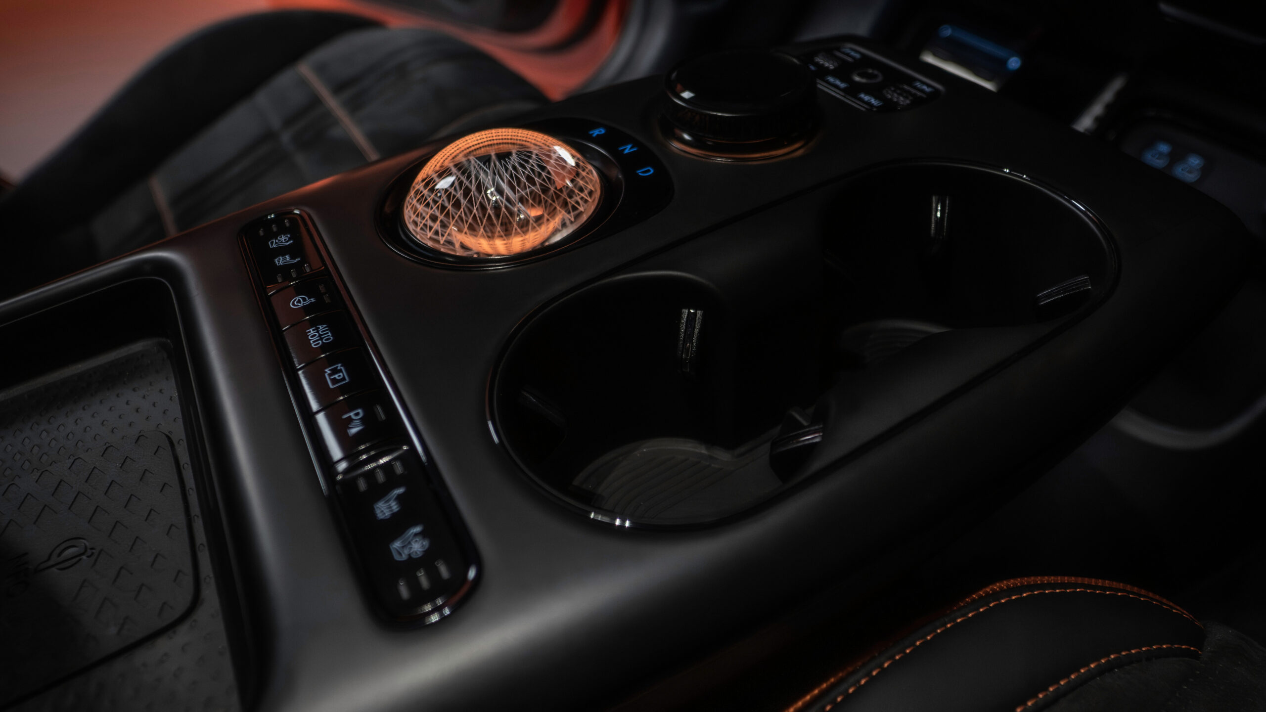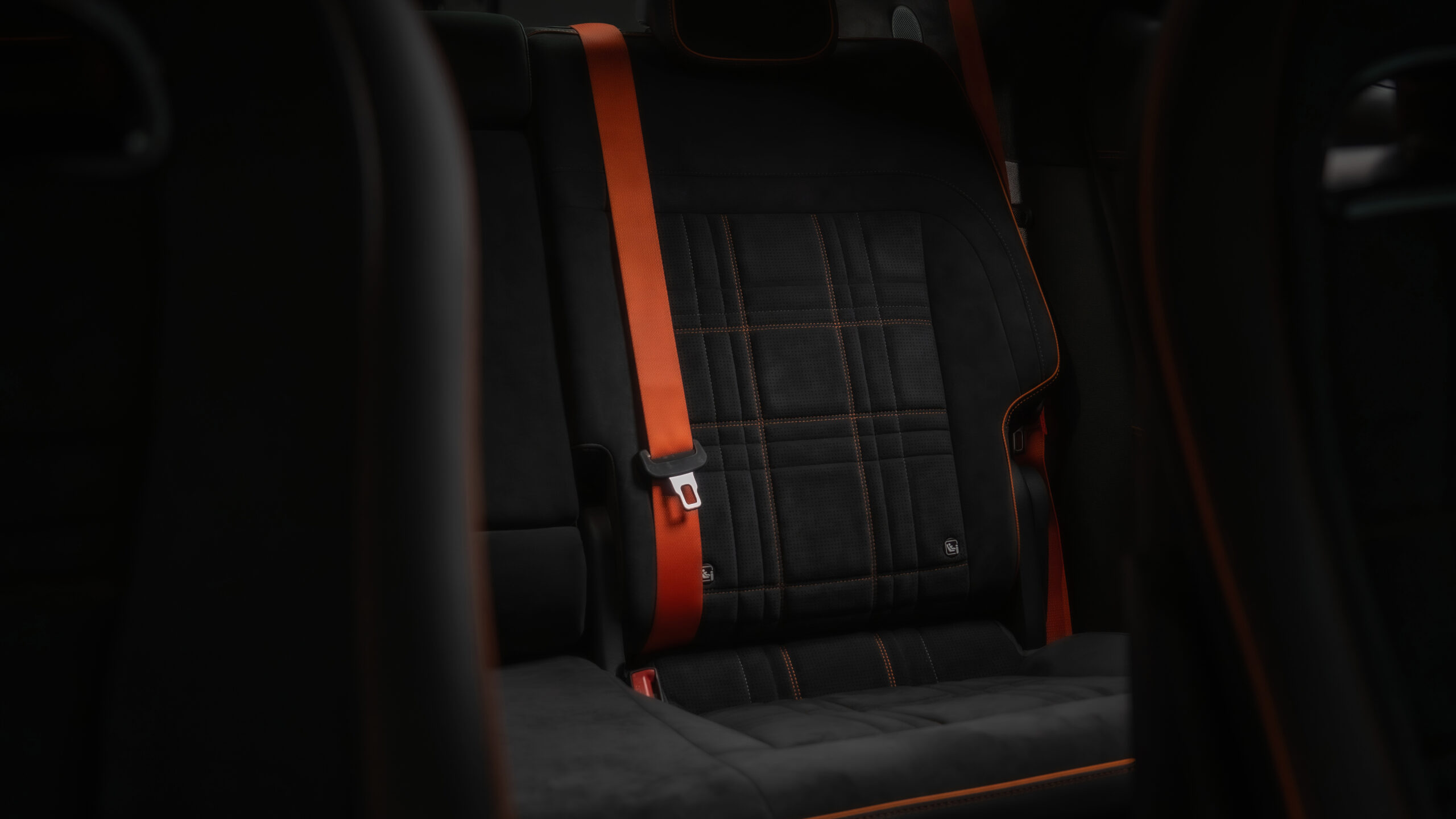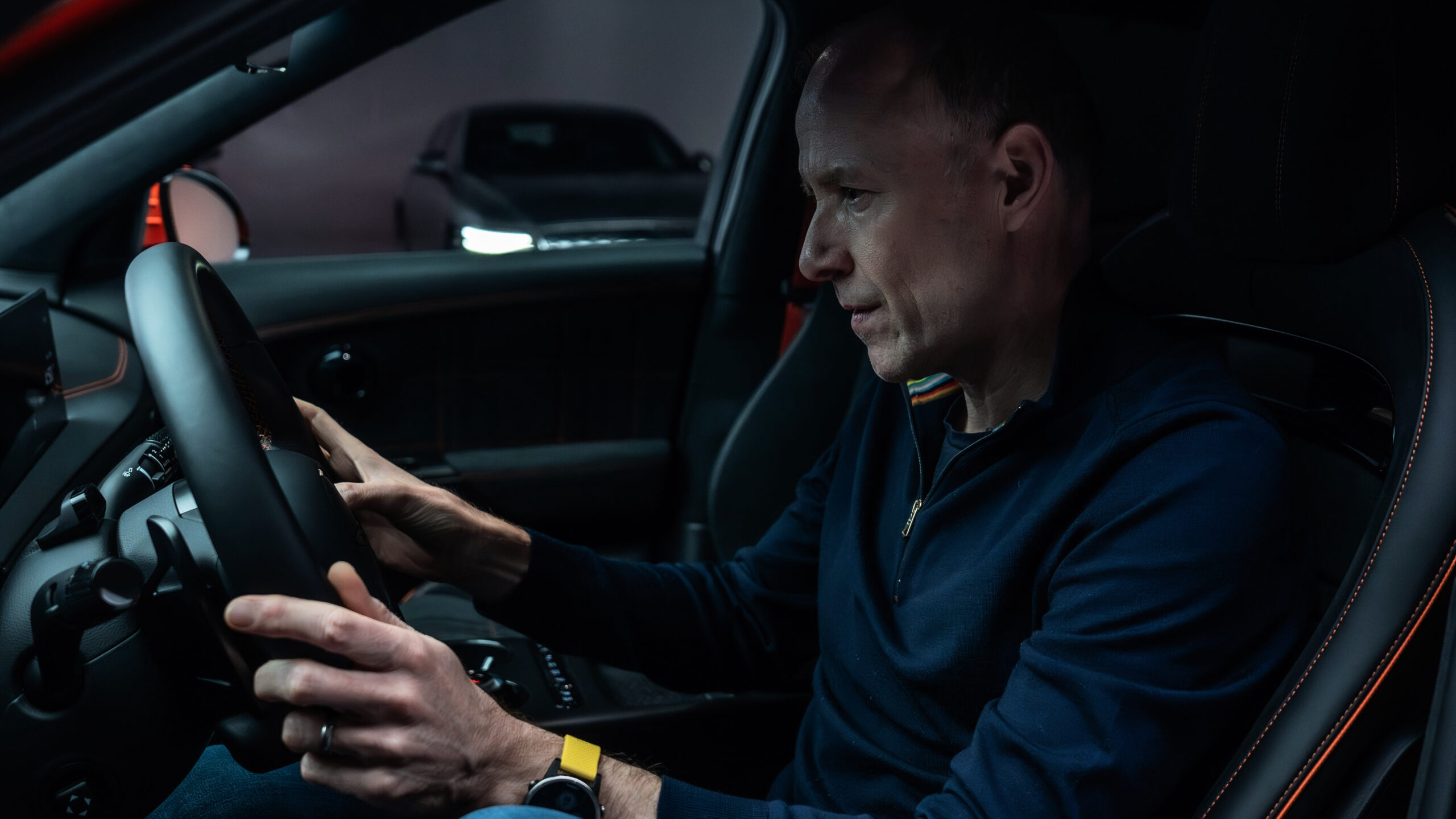 Внутри сиденья, дверь и центральная консоль обшиты из высококачественного материала, напоминающего камуфляж, с фирменным магма-оранжевым цветом, используемым для контрастных швов. Есть также уникальный руль с яркими оранжевыми кнопками для режимов привода и активации усиления.