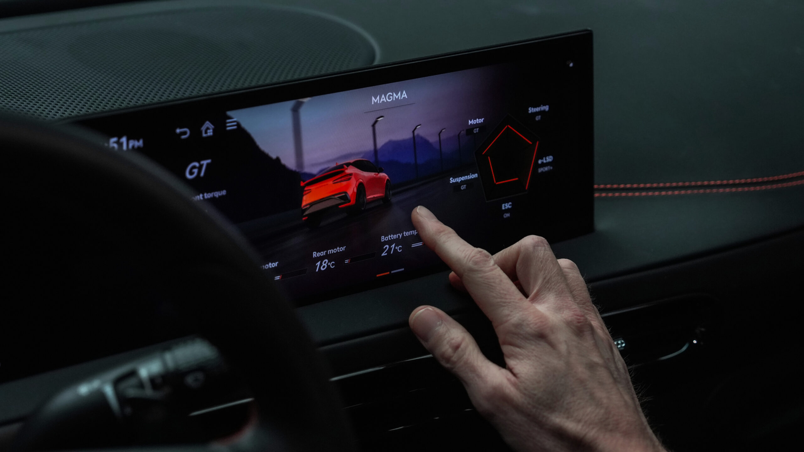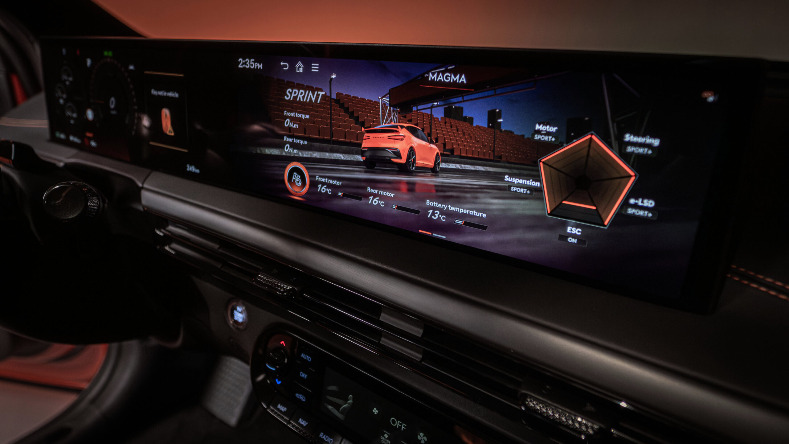 Когда активирован режим Магма, часть 27-дюймового панорамного дисплея перед водителем переключается на трехкольцевую компоновку, фокусирующуюся на жизненно важных данных вождения, таких как скорость, температура двигателя и батареи и силы G.