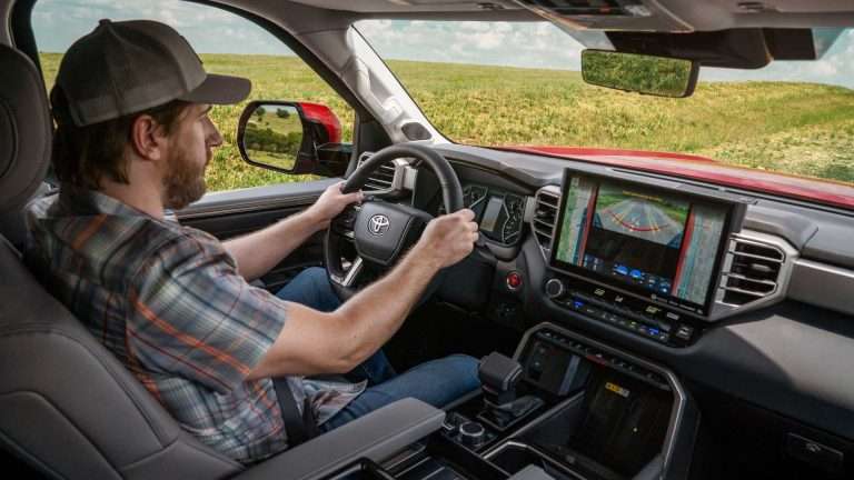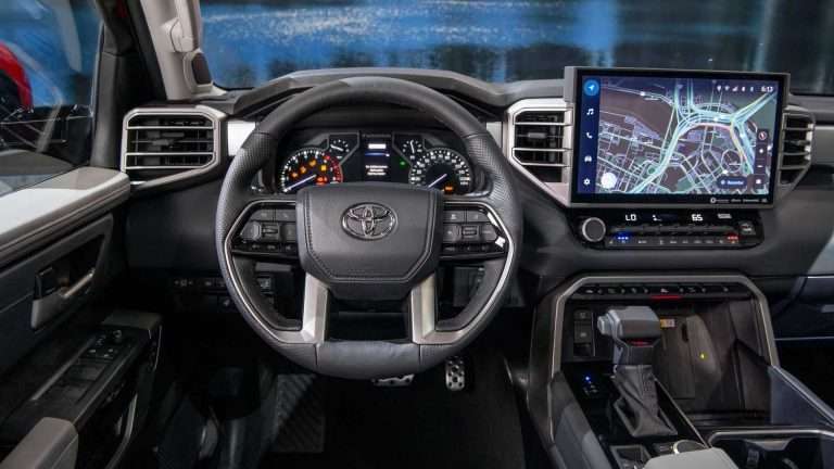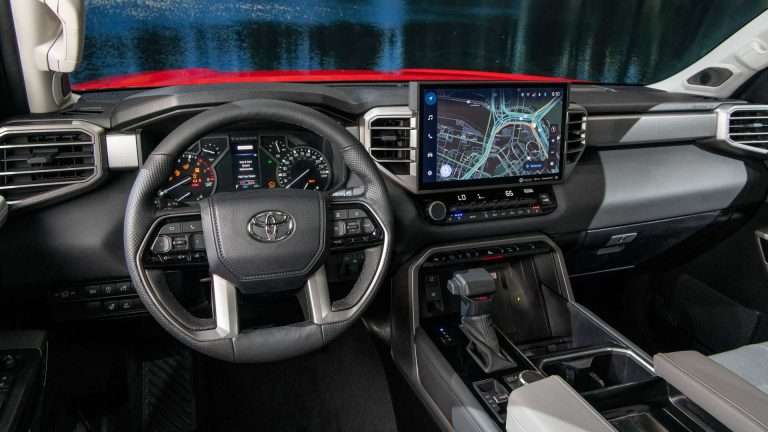 Внутри нынешние клиенты Tundra обязательно оценят впечатляющий обзор грузовика и прилично низкую приборную панель, хотя они могут быть шокированы количеством предлагаемых технологий. Базовая информационно-развлекательная система имеет размер 8,0 дюйма (по сравнению с 7,0 дюйма на старой Tundra), но более дорогие модели получат 14-дюймовый сенсорный экран, установленный высоко на приборной панели. Более того, он наконец отказался от ужасного информационно-развлекательного программного обеспечения Toyota в пользу нового технологического пакета, который стал гораздо более интуитивно понятным и отзывчивым. Apple CarPlay и Android Auto являются стандартными для всех моделей, и будут доступны такие улучшения, как интегрированная Amazon Music и Apple Podcasts.