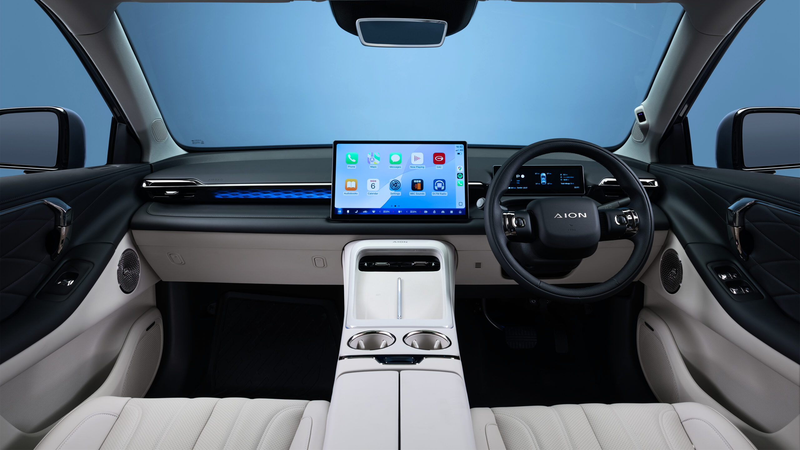 Другие стандартные комплекты включают 64-цветное окружающее освещение, полиуретановую веганскую обивку и 19-дюймовые колеса из алмазного сплава. Есть большой центральный сенсорный экран с подключением к Android и Apple и логически расположенными меню, и это до того, как Ллойд пробежит 10 000 тестовых миль и сообщит инженерам GAC о пересмотре программного обеспечения. Однако ему нужно будет запросить освещенные кнопки рулевого колеса.