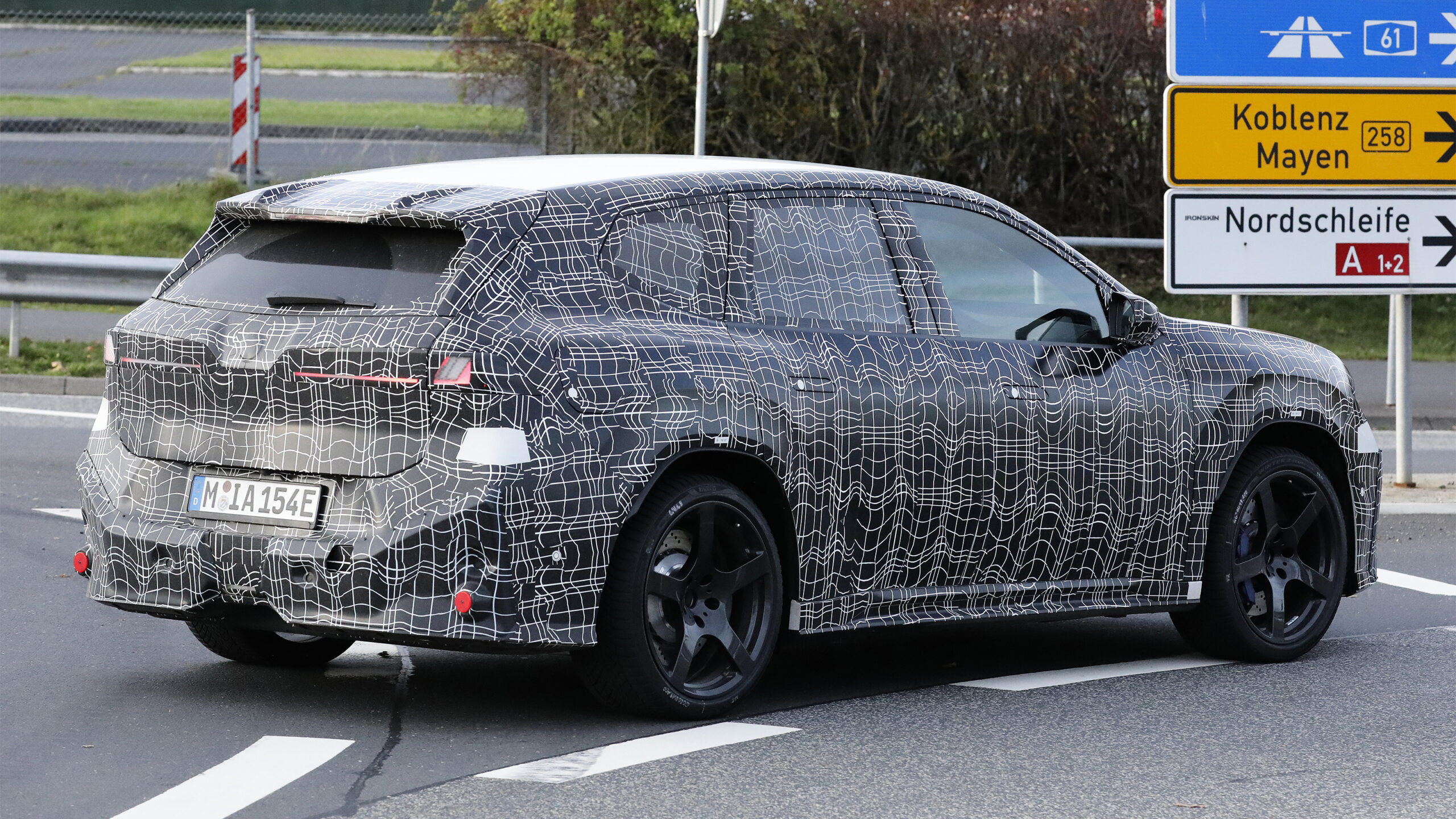 Тест-кар сидит на массивных пятиспицевых колесах, которые, как мы предполагаем, будут заменены на более замысловато оформленные обои на серийном автомобиле. Однако они дают нам хороший взгляд на тормоза iX3 M, которые кажутся намного больше, чем обычная настройка iX3s.