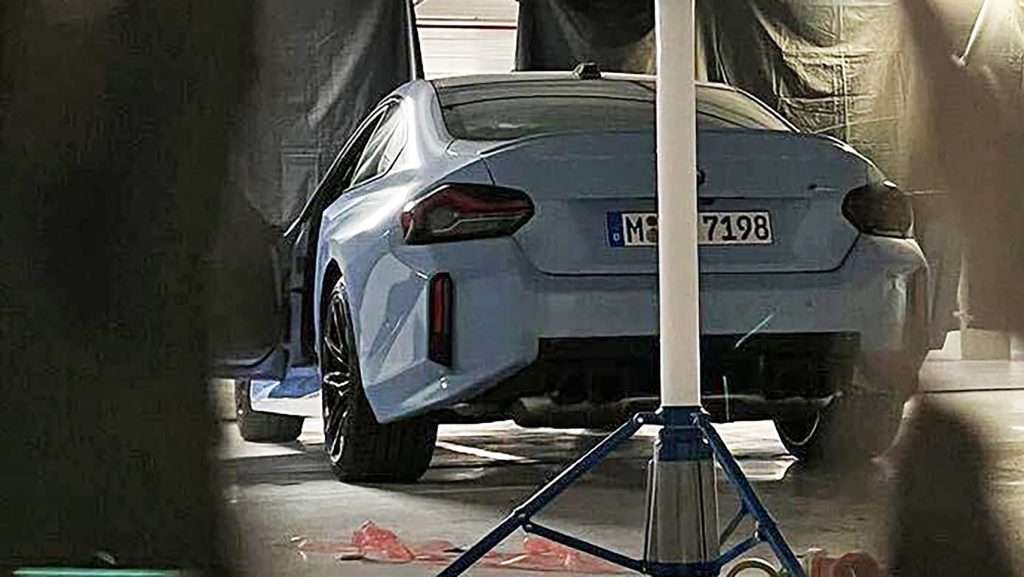 Задние фонари выглядят без изменений по сравнению со стандартной 2-й серией, но есть большие отличия в бампере с двумя вертикальными выемками для задних отражателей (как у уходящего M2) и большим вырезом внизу для заднего диффузора. Четырёхвыходные патрубки выхлопной системы BMW M также вернутся на M2. Похоже, что стартовый цвет, выбранный для M2, — это Yas Marina Blue — оттенок, впервые увиденный на F80 M3.