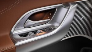 Рулевое колесо — это то же самое упрощенное устройство, что и на новом CLA Shooting Brake, в котором впервые за целое поколение интегрированы физические кнопки. Другие примечательные элементы включают щедрое использование металлических пластмасс вокруг дверей и решетки динамиков, контрастирующих с теплой кожей карамельного цвета.