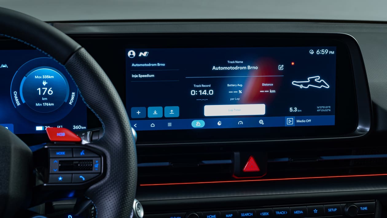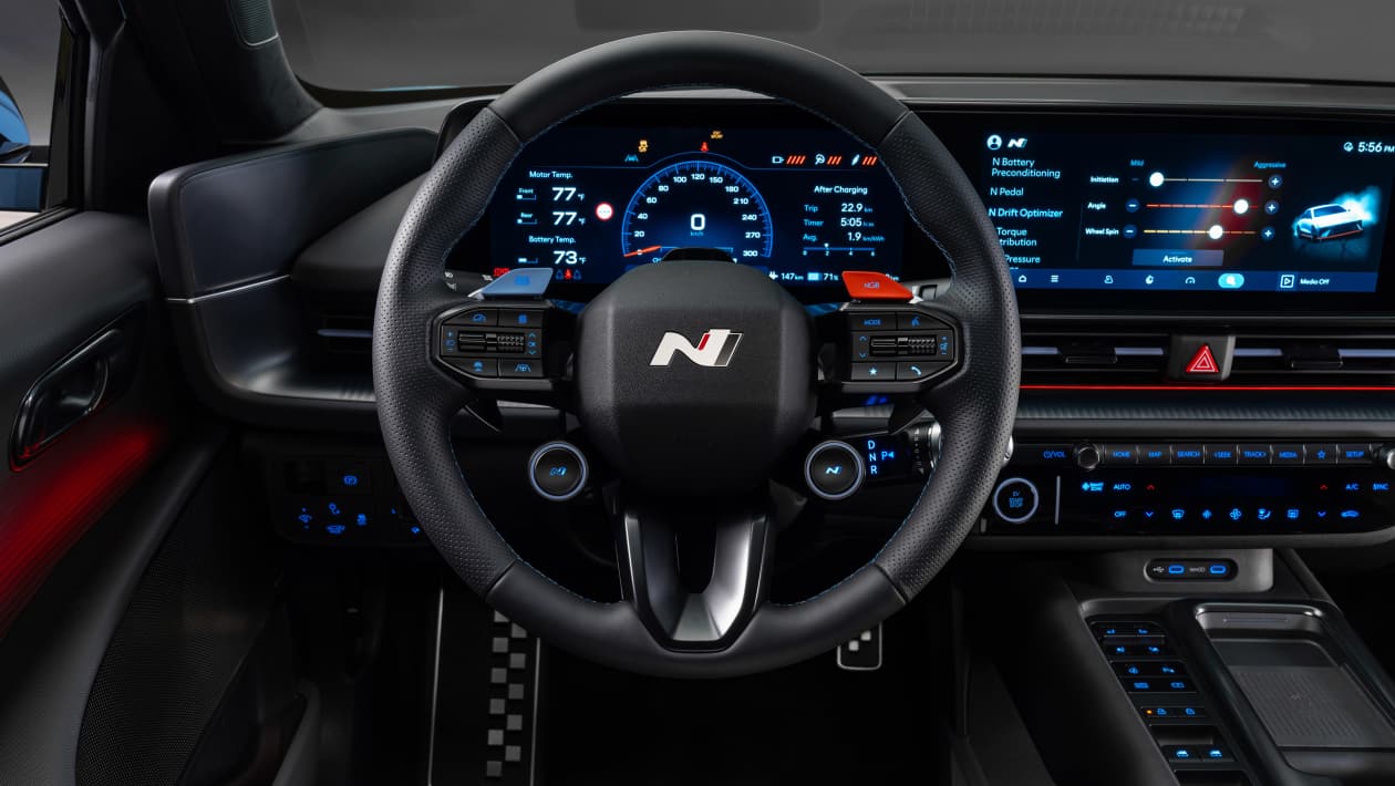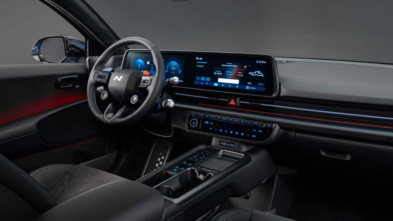 Кабина 6 Ns будет знакома любому, кто сидел или управлял Ioniq 5 N, с твердыми спинными сиденьями с освещенными логотипами N, окружающим освещением и двухэкранной информационно-развлекательной системой с встроенной навигацией, беспроводным подключением к телефону и индивидуальными меню N.