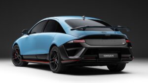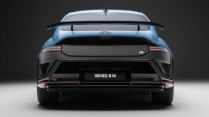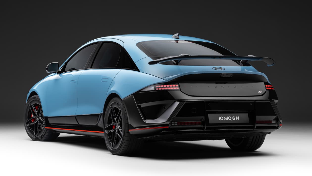 Ioniq 6 N получает большую часть той же технологии, прикрытой более низким, более изящным кузовом, с добавлением легких колес из сплава, огромного заднего крыла и спойлера утка.