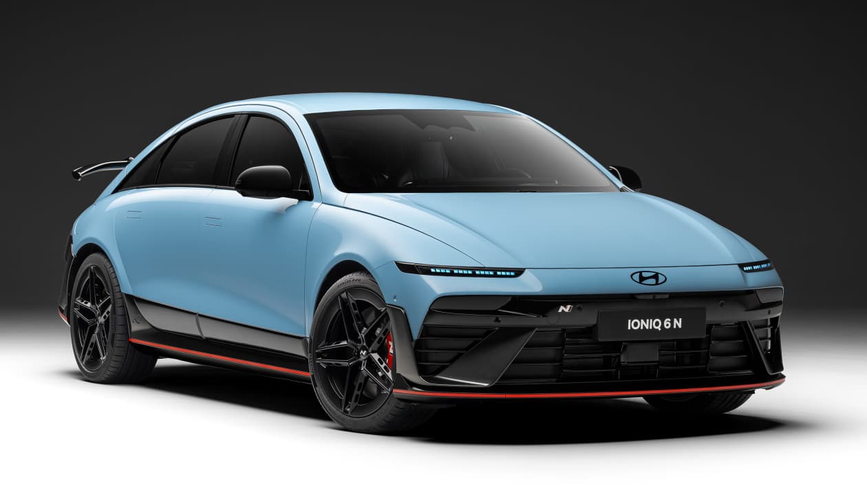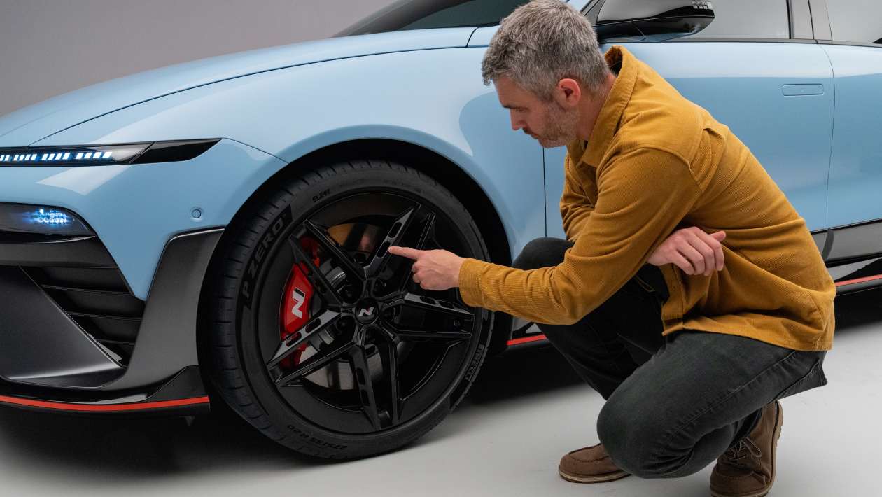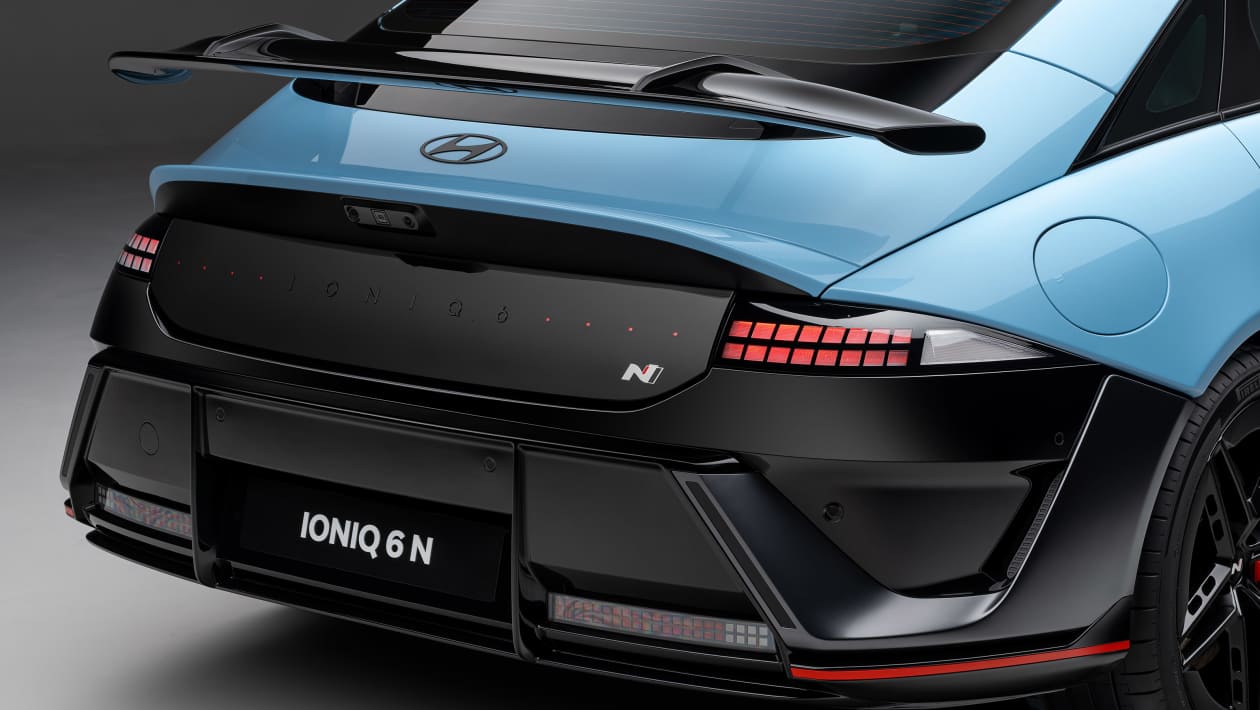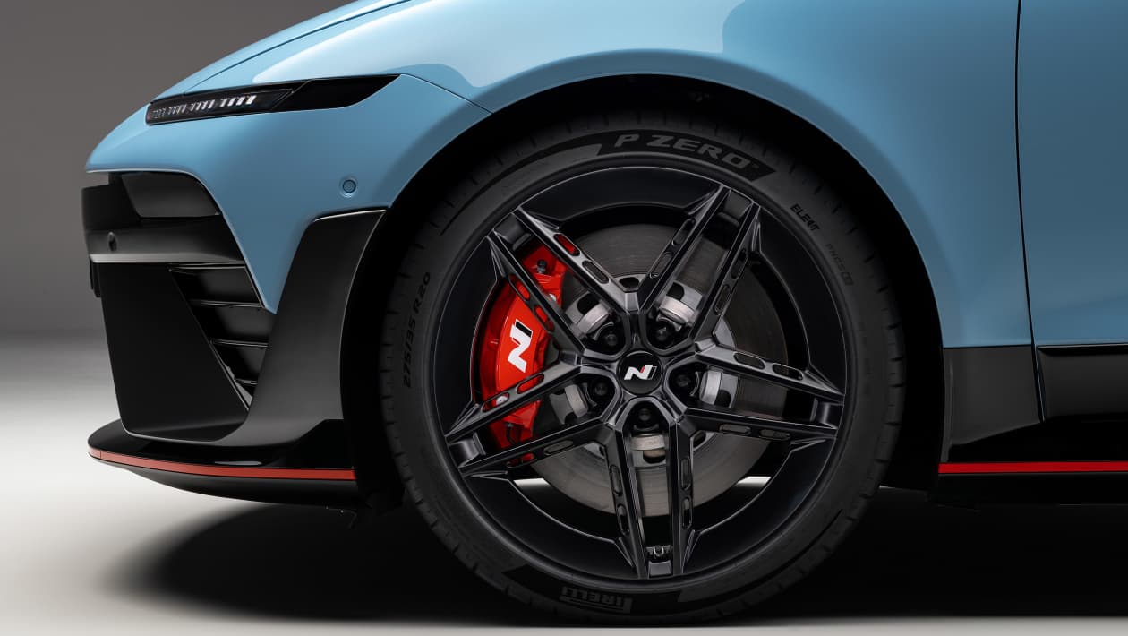 Как таковой, 6 N был расширен на 60 мм по сравнению со стандартным автомобилем, с выпуклыми колесными колесами, обернутыми вокруг новых 20-дюймовых колес и индивидуальными шинами Pirelli P-Zero 5. На основе недавно обновленного Ioniq 6, N получает разделенные фары и дневные светофоры, а также более длинный, нижний нос и множество аэродинамических и охлаждающих функций, расположенных в новом переднем бампере.