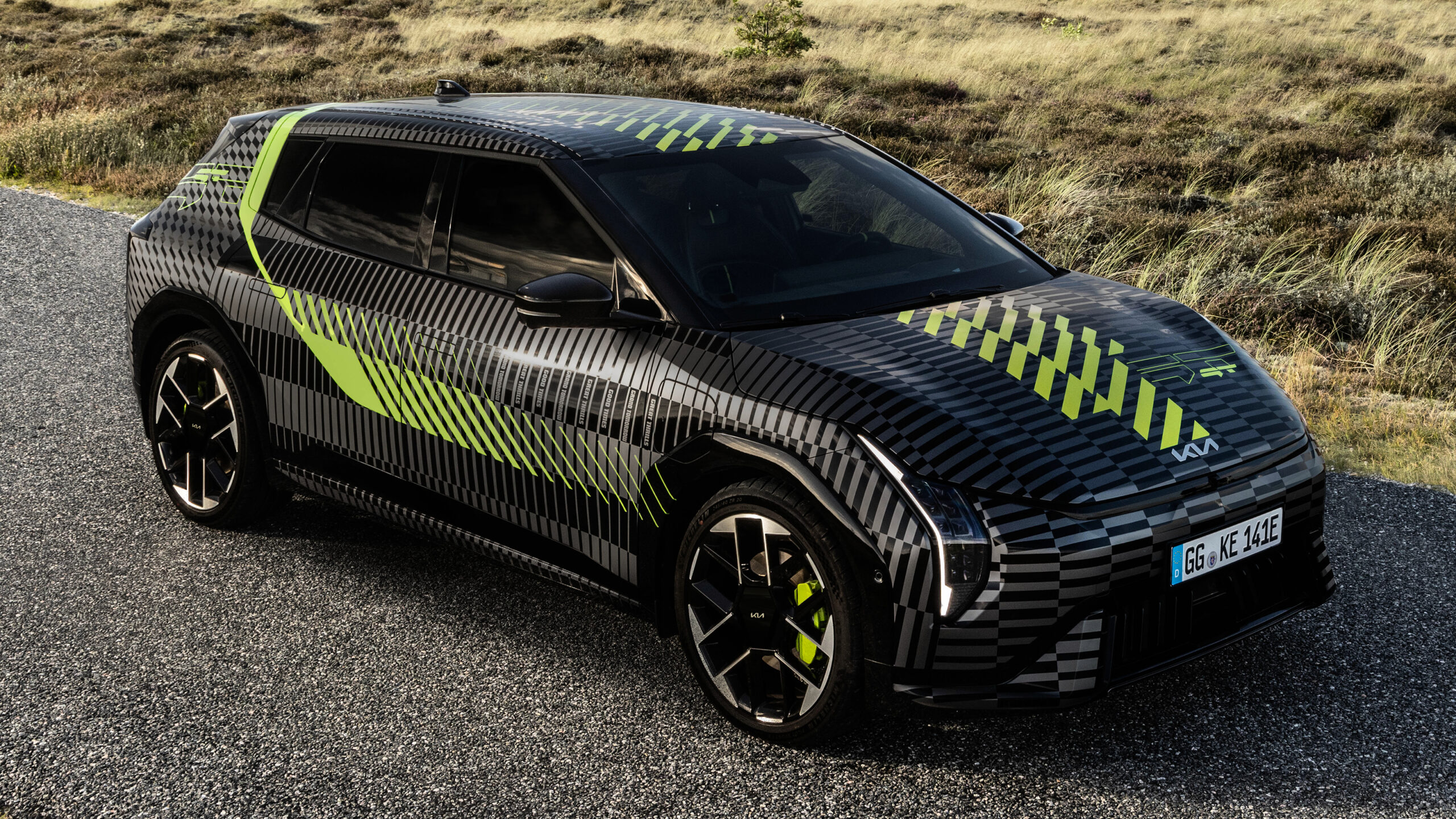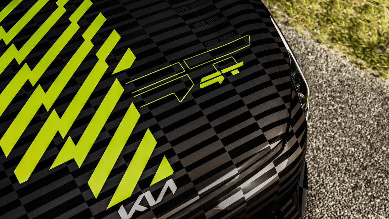 Поскольку пока еще далеко до представления электрического горячего люка, Kia покрыла его в «GT Wrap», чтобы скрыть от нас некоторые детали стиля, но не скрывает неонно-зеленые тормозные калибры автомобиля или уникальные 20-дюймовые обои, а также то, что выглядит как новые передние и задние бамперы.