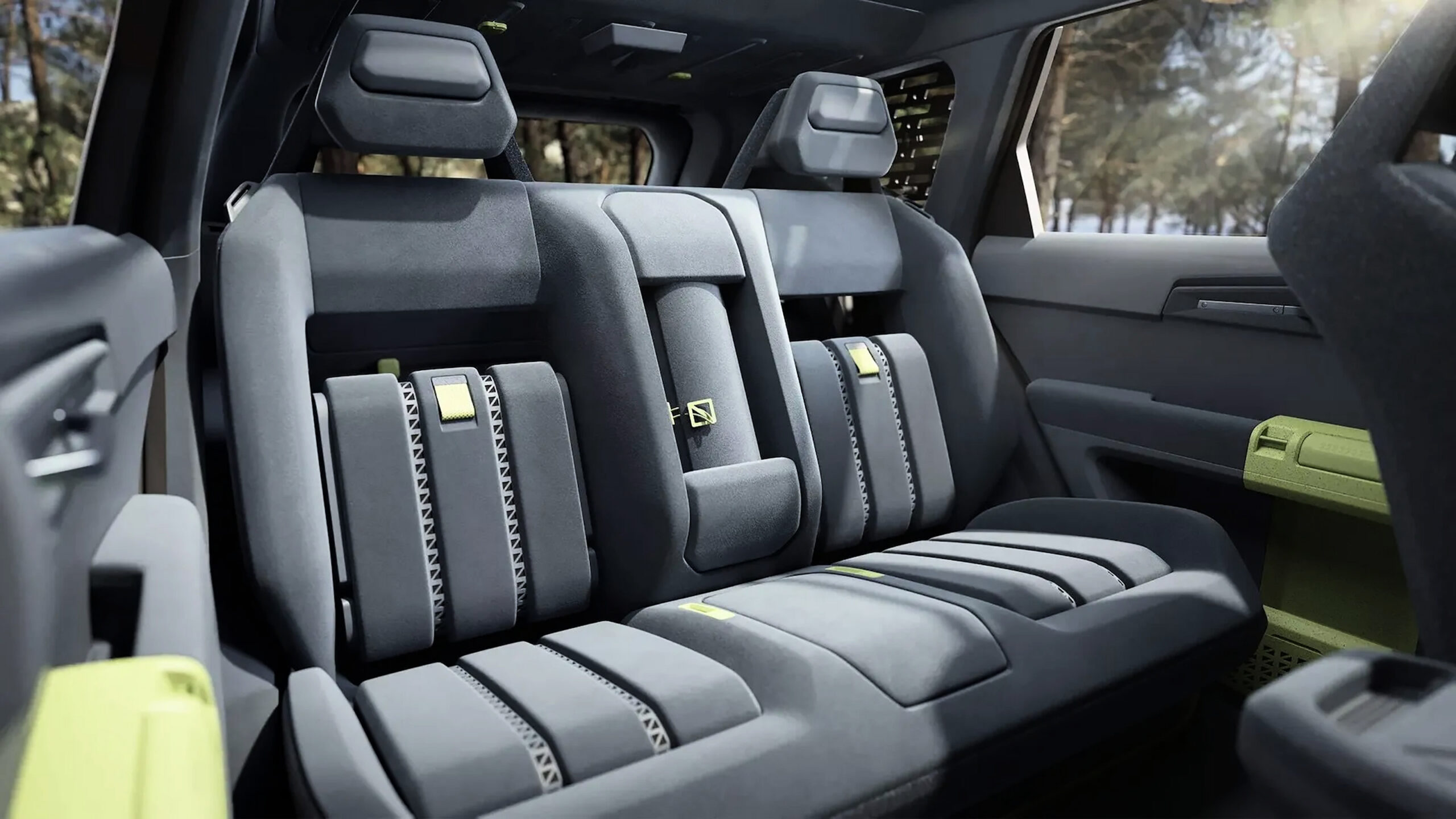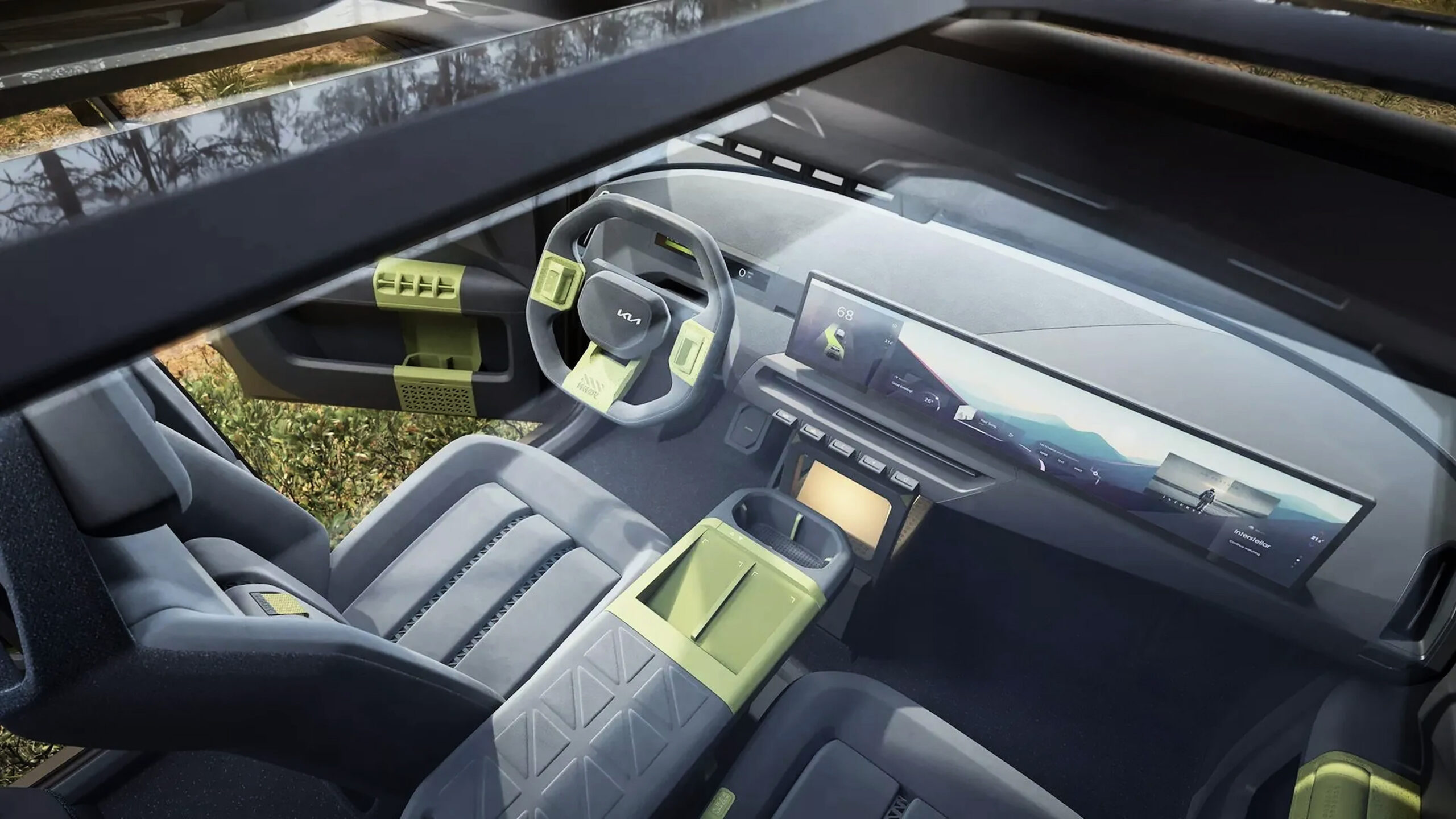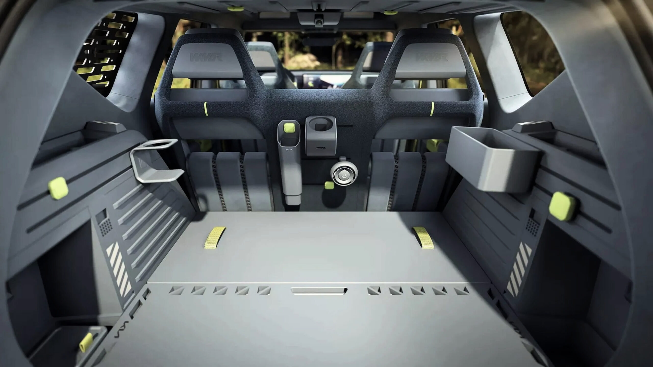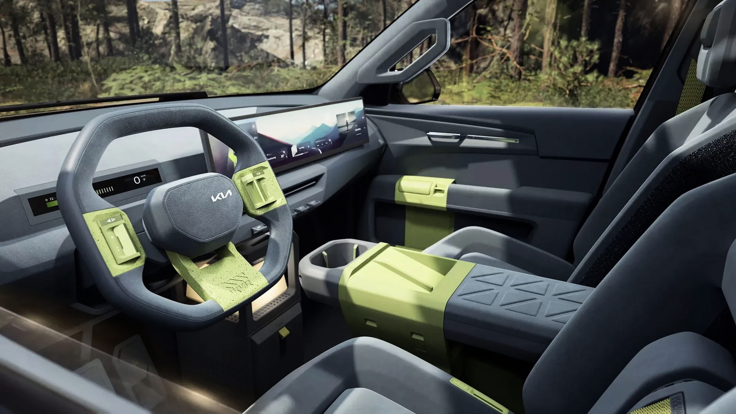 Как мы уже видели с другими концепциями Weekender от Kia, этот EV5 получает матовую бежевую окраску с лаймовыми деталями. Есть также более широкие подвески, новые боковые пороги, кронштейн на капоте, стойка на крыше и уникальные бамперы спереди и сзади с встроенным сценарием WKNDR.