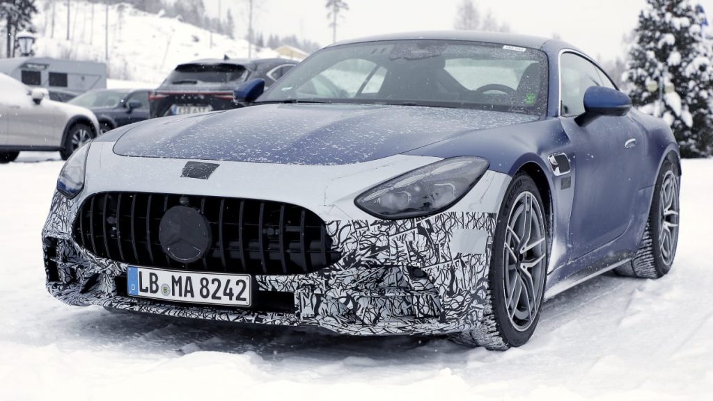 Передняя часть получит собственный бампер с меньшими воздухозаборниками по бокам и решетку радиатора нового стиля Mercedes Panamerica. Мы уже видели разделенные 20-дюймовые колеса с пятью спицами, которые этот тестовый автомобиль использует на новом SL 43, который теперь использует ту же платформу, что и AMG GT. Учитывая снежные условия здесь, неудивительно, что они обуты в зимние шины Michelin.