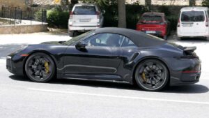 Прототип Turbo Cabriolet с мягкой крышей, который мы увидели пару недель назад на том же участке дороги, где мы увидели предстоящий 911 Speedster, ехал на новом наборе колес, оснащенных аэрооптикой, с механизмом центрального блокирования, который уменьшает вес.