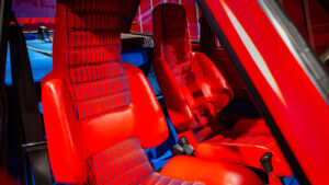Внутри Turbo 3E есть два сиденья из углеродного волокна с шеститочечными ремнями, рулонная клетка, где вы могли бы ожидать, что будут задние сиденья, рычаг ручного тормоза в стиле ралли, выступающий из центральной консоли для выполнения идеальных дрейфов, и в ноге пассажира сообщение accroche toi, что означает hang on.