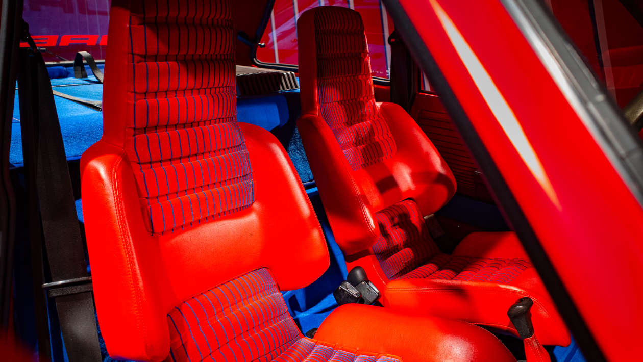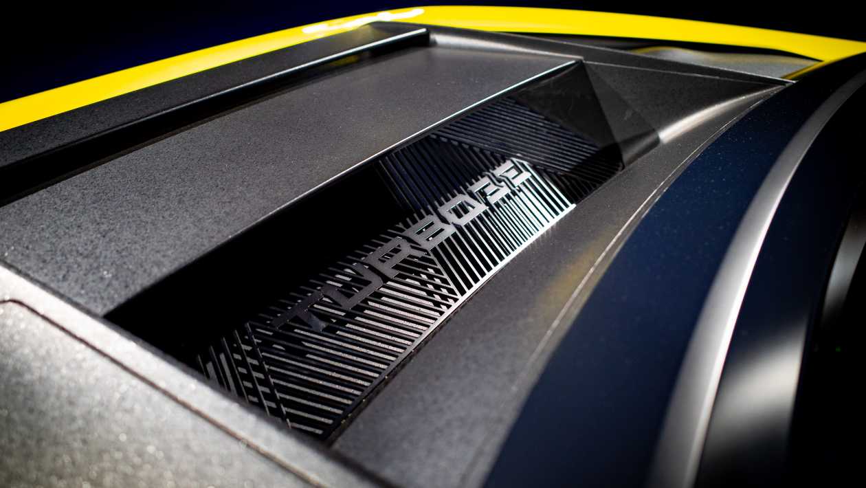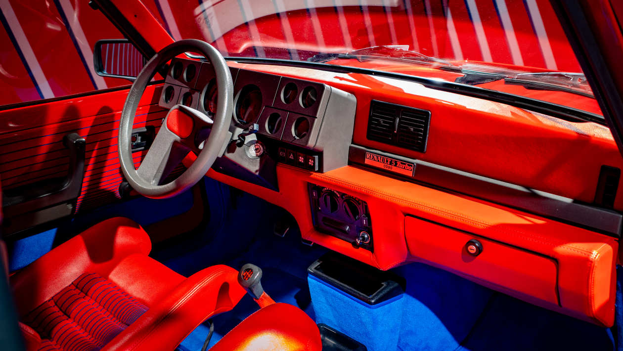 Внутри Turbo 3E есть два сиденья из углеродного волокна с шеститочечными ремнями, рулонная клетка, где вы могли бы ожидать, что будут задние сиденья, рычаг ручного тормоза в стиле ралли, выступающий из центральной консоли для выполнения идеальных дрейфов, и в ноге пассажира сообщение accroche toi, что означает hang on.