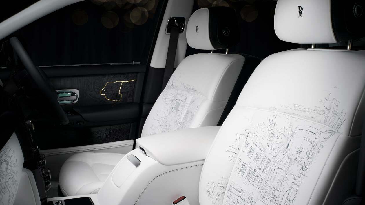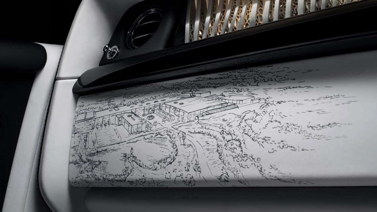 Облицовка крыши отличается обычными элементами звездного света Rolls-Royce, но к этому дополнительно 440 000 отдельных вышитых швов создают потрясающую сцену, вдохновленную фабрикой Goodwood.