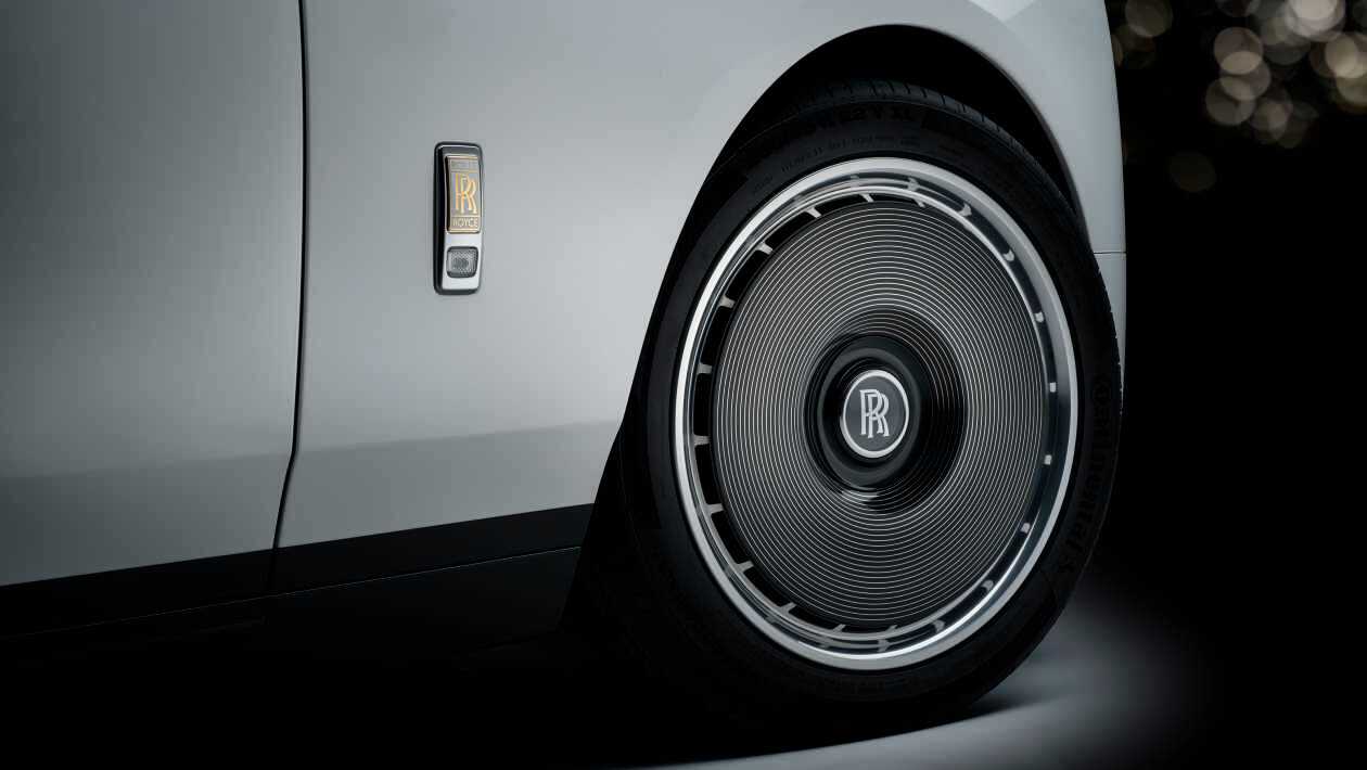 22-дюймовые плиточные колеса также уникальны и имеют 25 тонких полос, которые представляют собой каждую из 25 единиц, которые концентрически окружают значок Rolls-Royce в центре.