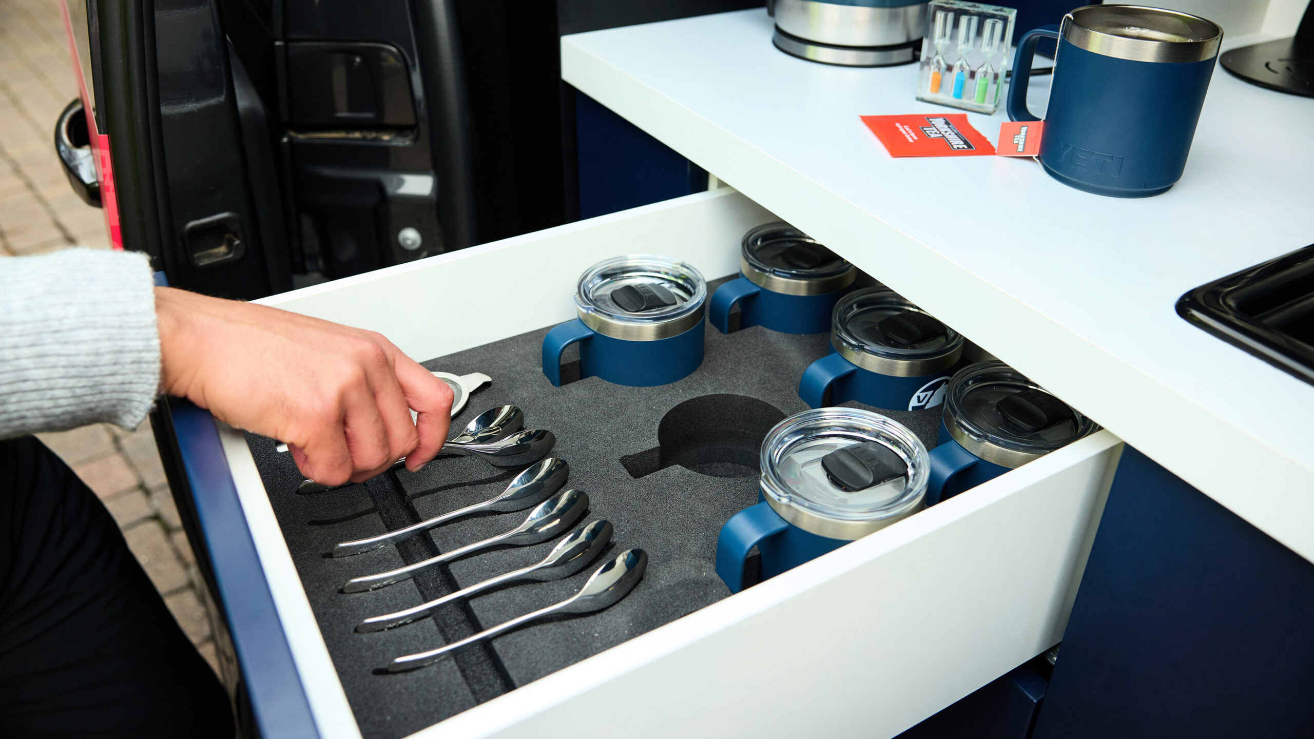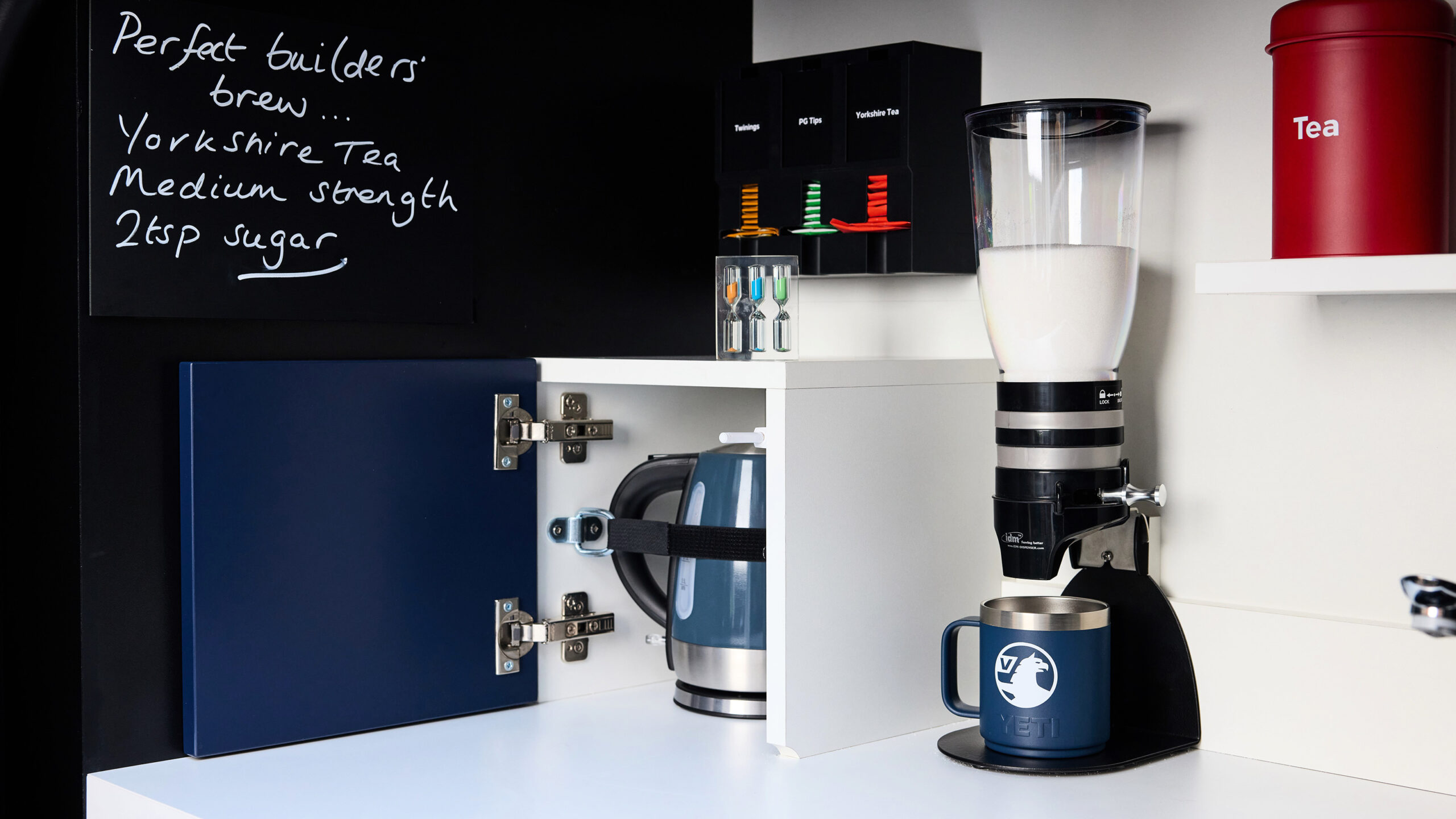 Vauxhall Vivaro Electrici-Tea поставляется со всем, что необходимо для приготовления этого важного напитка. Есть электрический чайник, диспенсер для чайных пакетов, чайный таймер, термокубки, холодильник и раковина с 10-литровым источником воды, а также баночка для печенья (или других закусок, связанных с чаем). Все чайные изделия можно хранить в специальных помещениях, чтобы избежать разливов при перемещении.