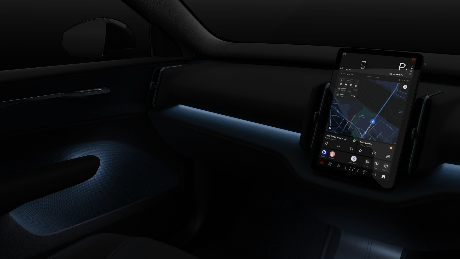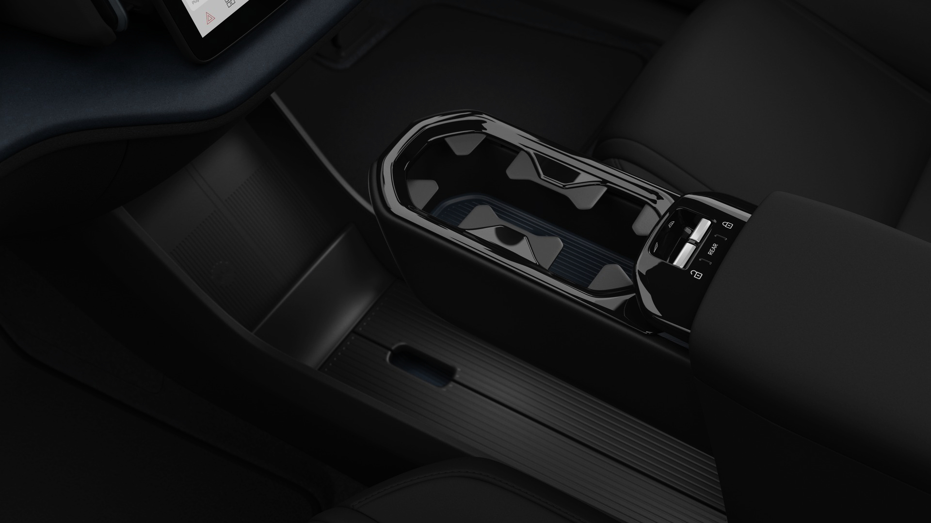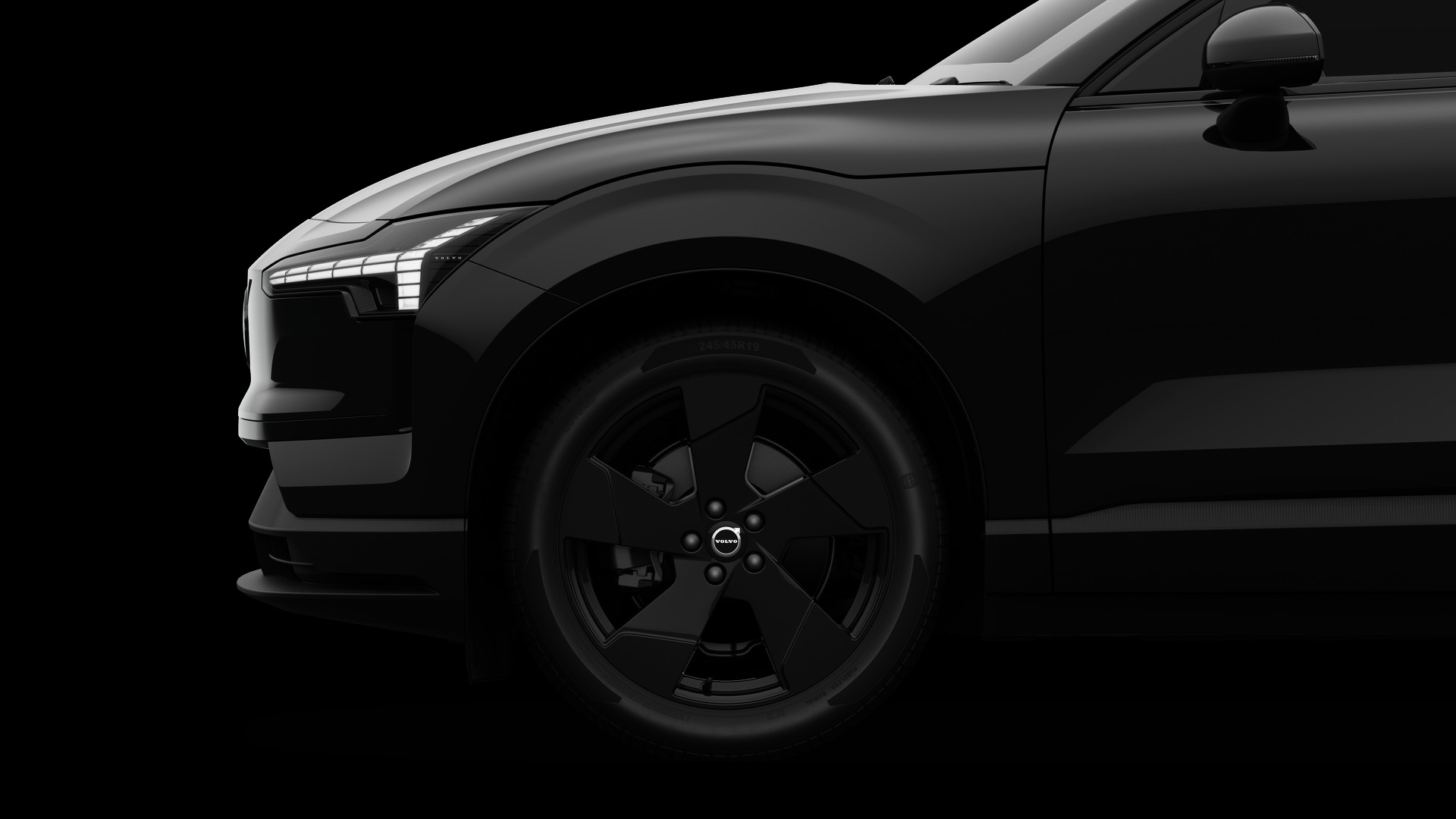 В Black Edition нет много нового. Есть специальные колеса, окрашенные в глянцевый черный цвет, затемненный значок на фасции и черный сегмент на столбе C. Неудивительно, что единственным вариантом окраски является Onyx Black — это бесплатный вариант на стандартном EX30 в любом случае. Volvo не совсем пошел на то, чтобы сделать интерьер полностью черным, как внешний. Здесь вы найдете цветовую гамму Indigo Interior с глубоким синим для сидений и DashCoin.
