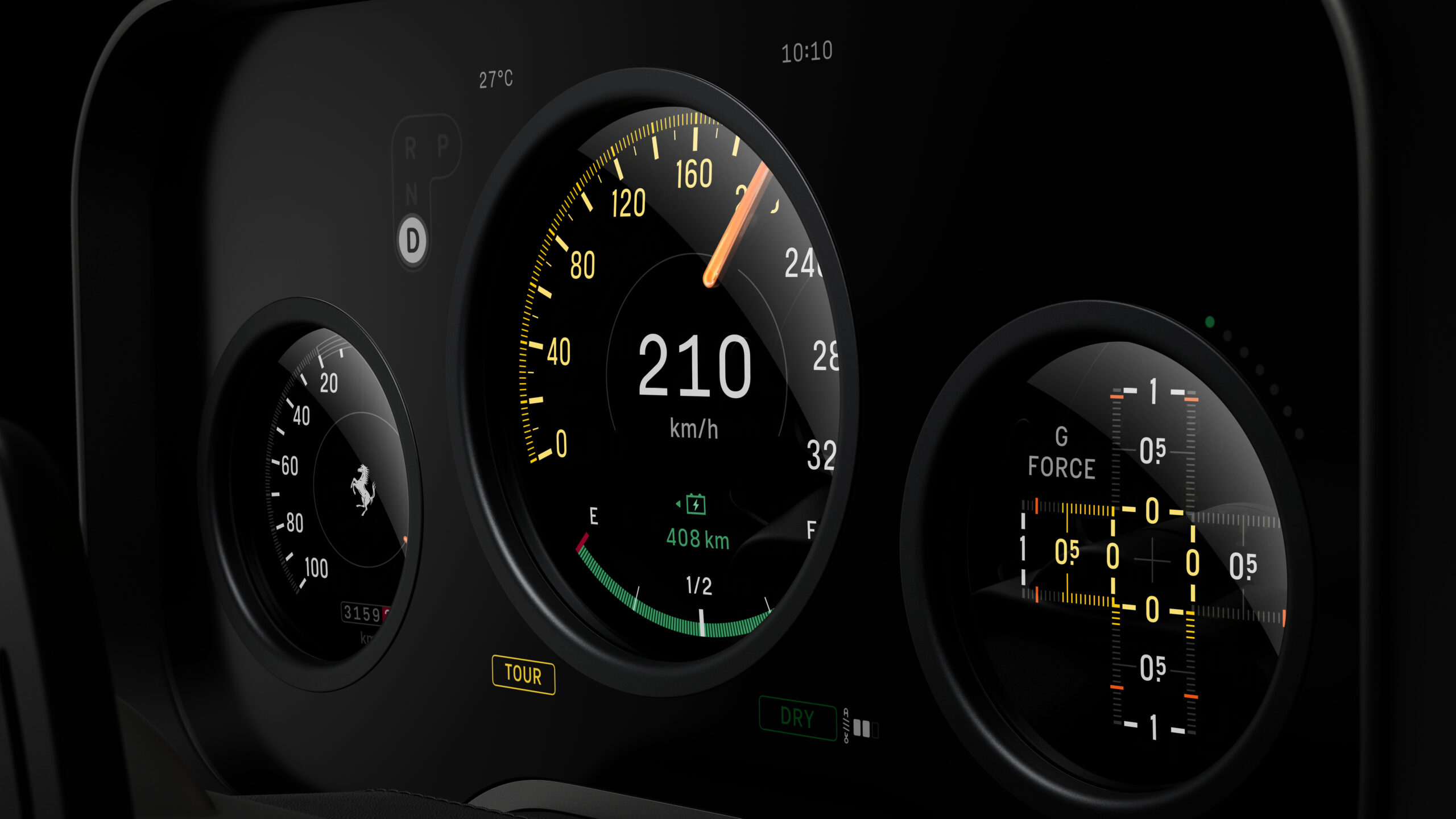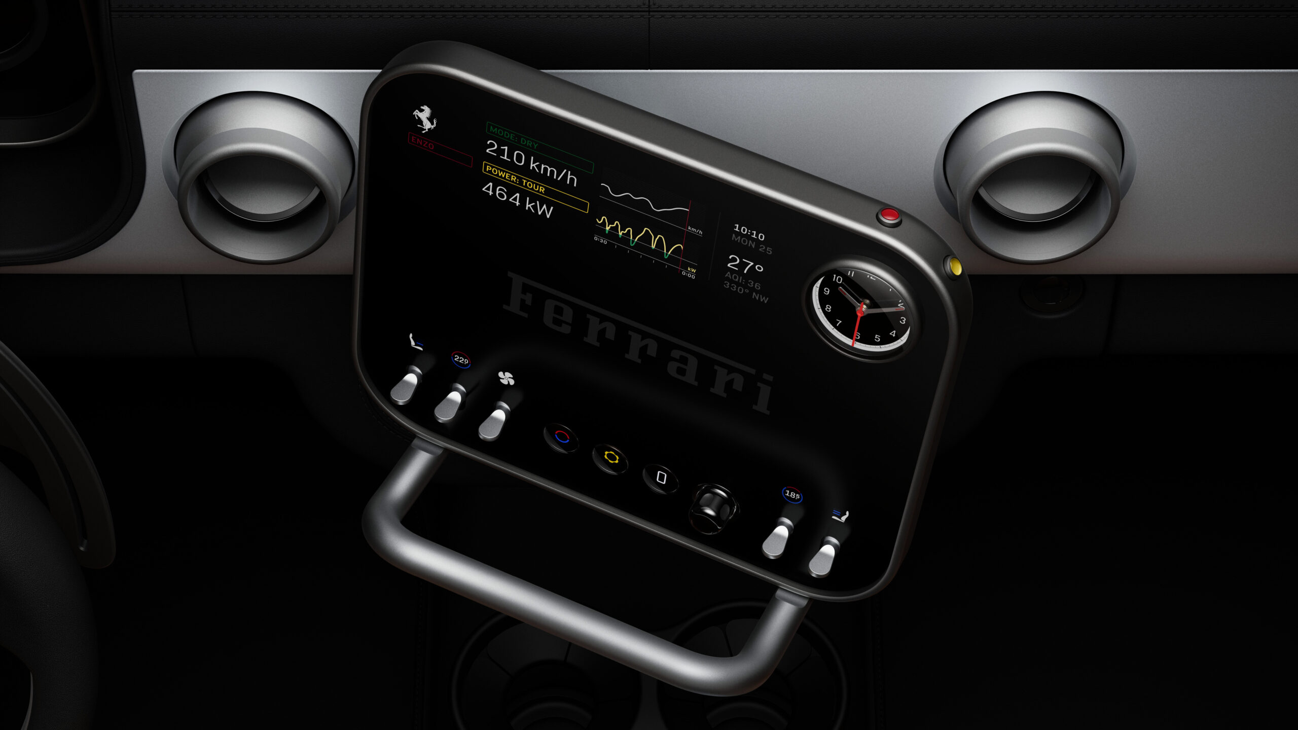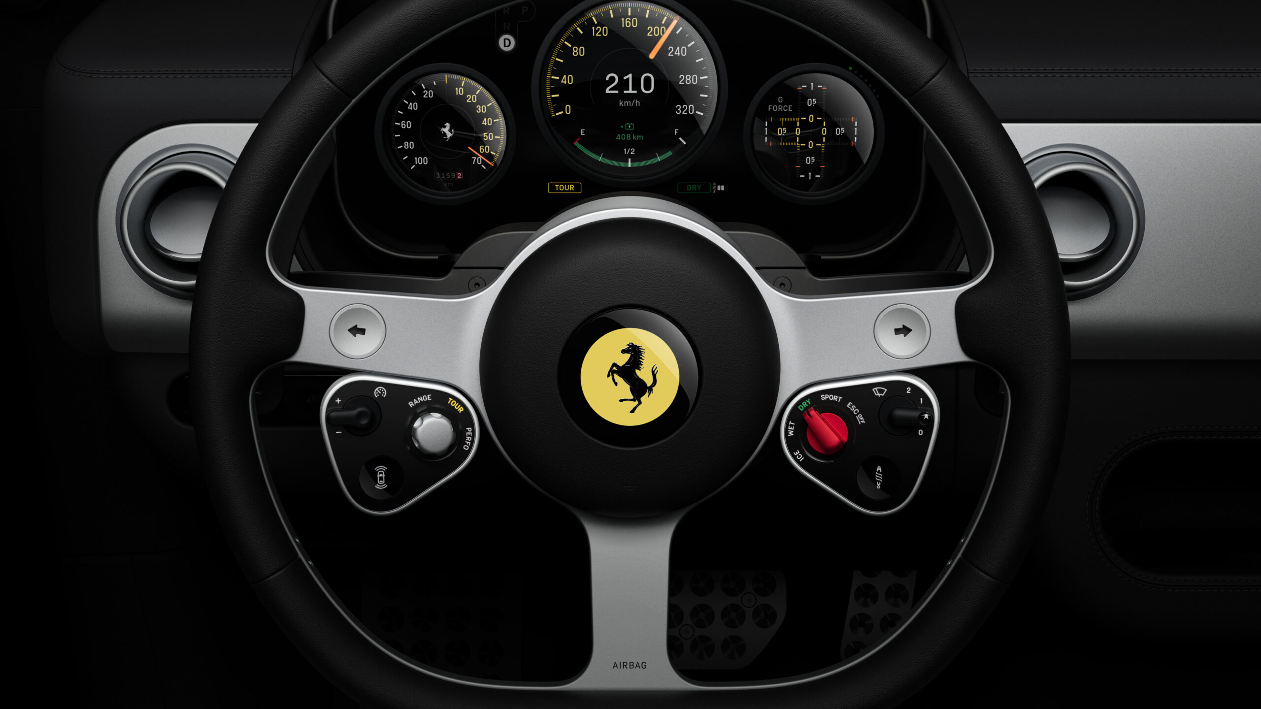 Сами интерфейсы также спроектированы так, чтобы имитировать классические вращающиеся циферблаты, причем Ferrari утверждает, что они имеют часовую четкость, ссылаясь на классические инструменты пятидесятых и шестидесятых годов — как рулевое колесо.