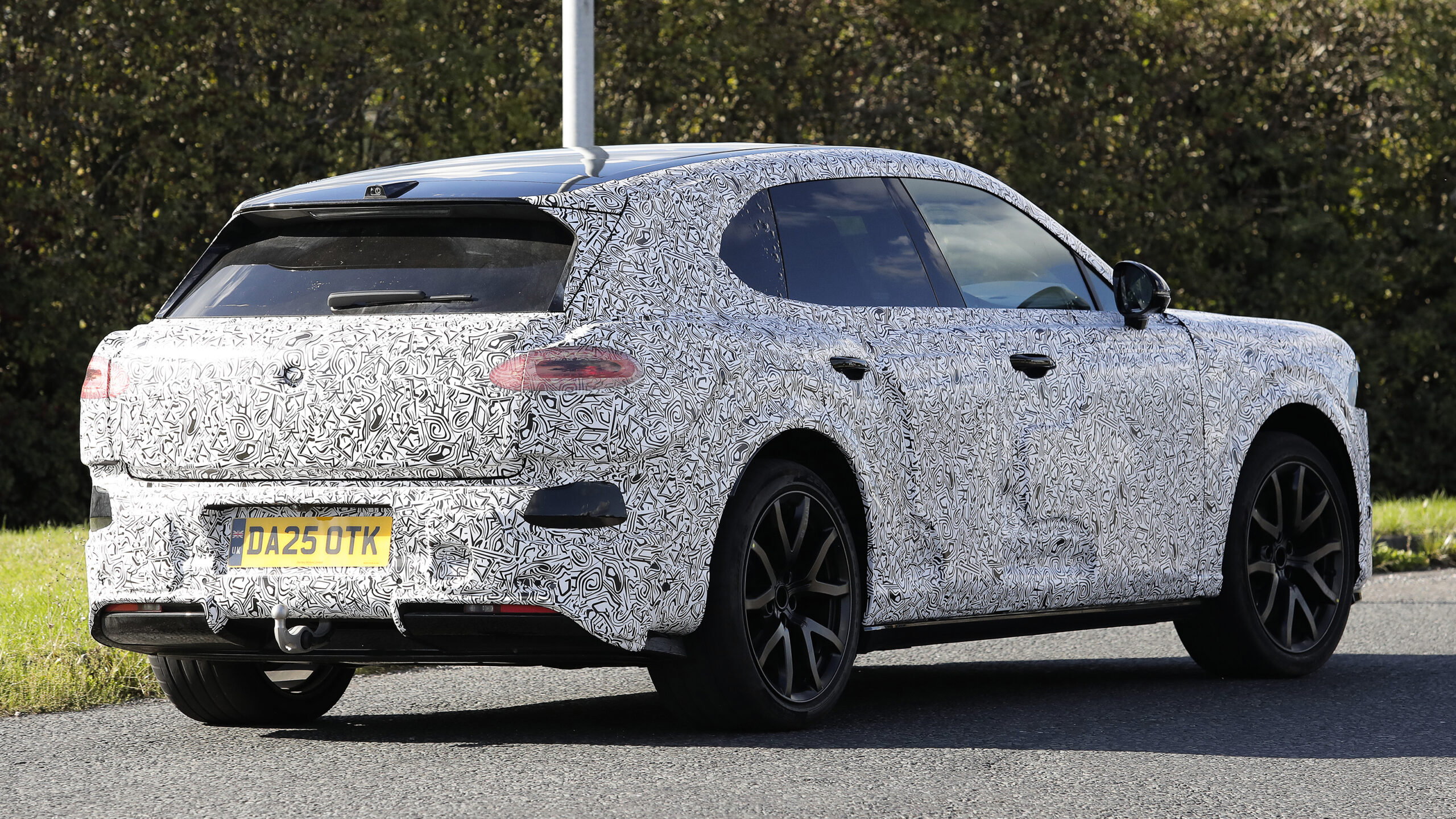Задняя дверь и нижний задний бампер все одеты в камуфляж, но ожидают, что общий дизайн уйдет от существующих овальных форм Bentayga и Continental. Вместо этого на него будет влиять EXP15 и его более угловое заднее освещение.