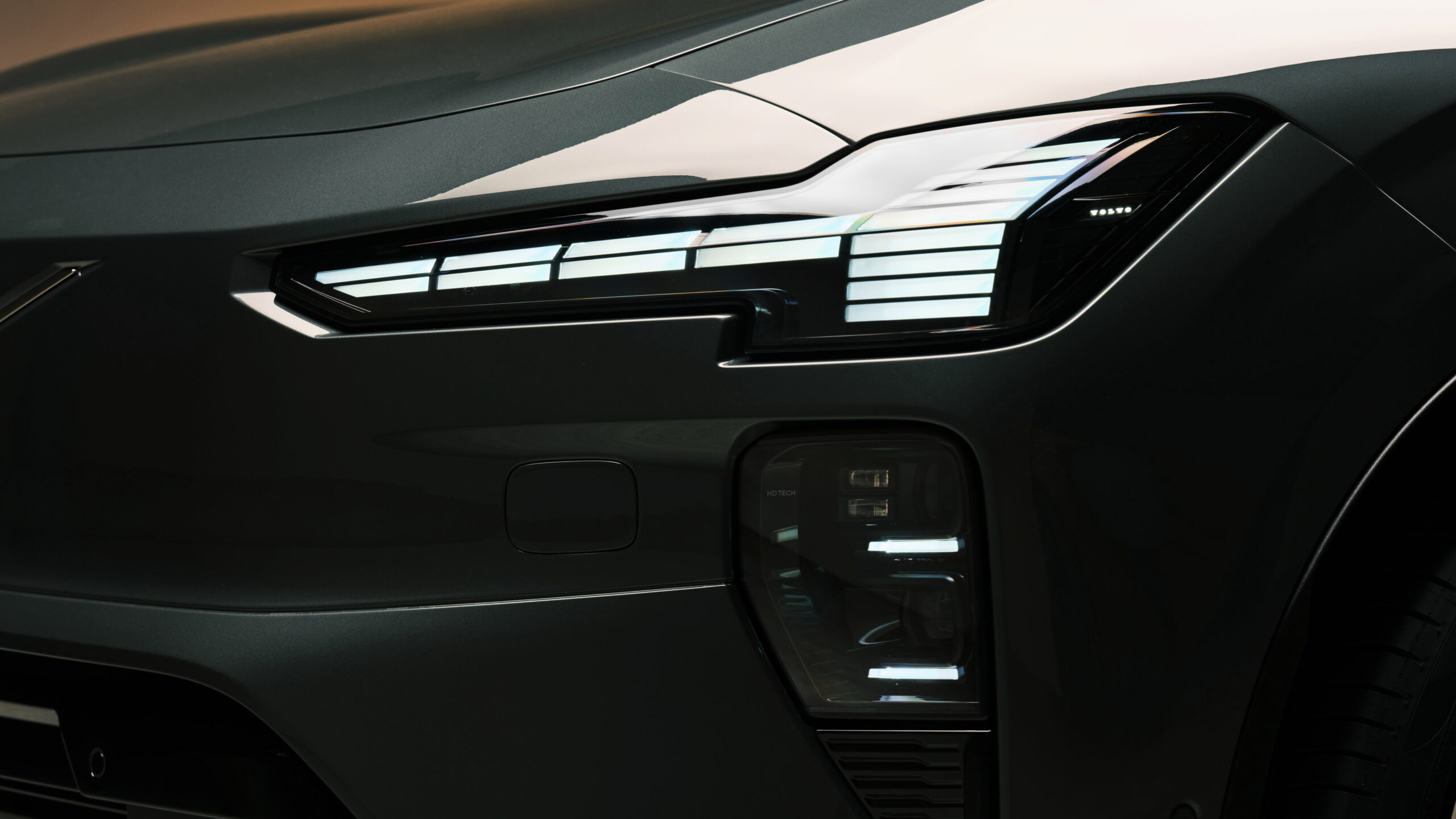 На носу представлена типичная для Volvo подпись Thor’s hammer lighting, но сами фары установлены ниже в небольшом вертикальном корпусе, который больше похож на туманный фонарь. Нет решетки, как мы видели на EX30 и EX90, и только небольшой нижний впуск нарушает дизайн.