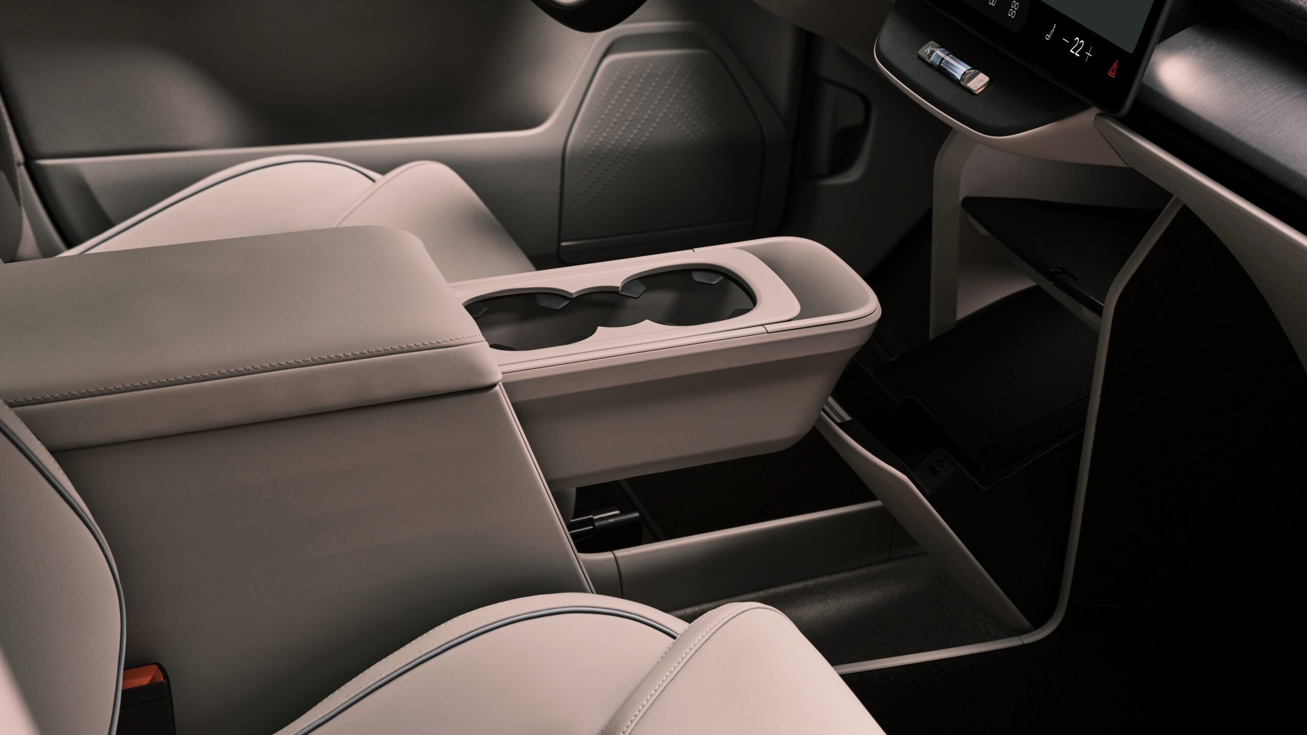Тем не менее, внизу нет подключенной центральной консоли. Вместо этого есть большой центральный ящик для хранения с небольшой полкой, установленной выше. Между сиденьями есть еще один ящик, из которого выступает двойной держатель чашки и телефон.