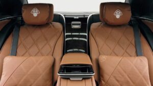 Внутри продолжается роскошный подход, с обивкой из шелковой коричневой кожи Наппа, высокоблестящей коричневой обшивкой из орехового дерева и бриллиантовой крышкой.