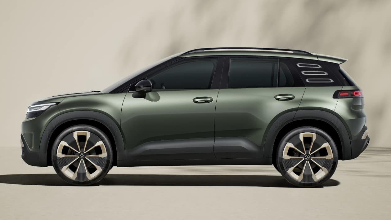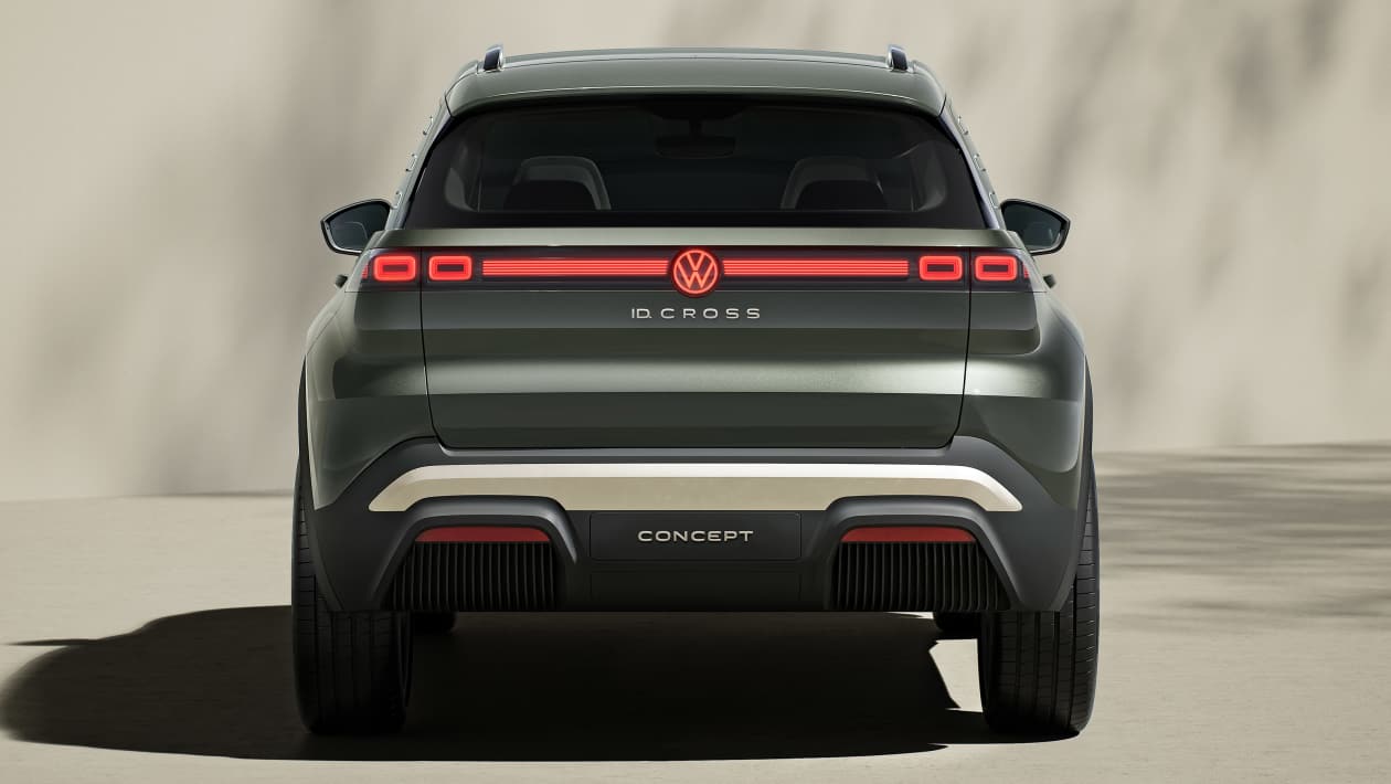 ID. Cross имеет мускулистую позу благодаря расширенным колесным колесам и еще большей облицовке. Сбоку вы видите плавучую конструкцию крыши, с зеленой краской Urban Jungle, разбитой черными A и C-столпами. Три лювера сзади — это кивка оригинальному VW Bus и новому ID. Buzz MPV, в то время как угловая форма C-столпа получена из различных поколений хэтчбека Golf.