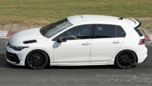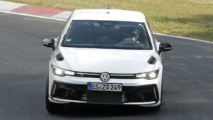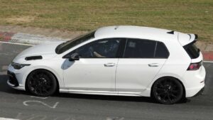 Это предположение подтверждается тем, что может быть большим радиатором, установленным за модифицированной нижней решеткой. Мы не можем точно увидеть, есть ли какие-либо дополнительные передние охладители зарядки, как вы увидите на других высокопроизводительных моделях, таких как Mercedes-AMG A45 S. Внешние края главного входа были открыты по сравнению со стандартным Golf R, где они, вероятно, будут сидеть.